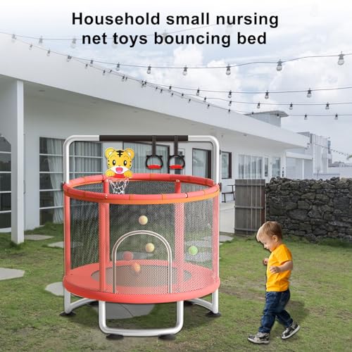 Kids Trampoline, Adjustable Toddler Trampoline with Basketball Hoop, Swing, Sandbag, Ocean Balls, 200kg Indoor Outdoor Children Bouncer with Safety Enclosure Net, Gymnastics Rings
