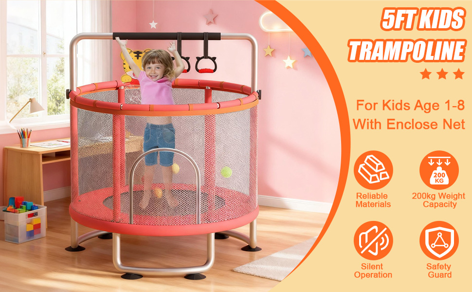 【Adjustable Gymnastics Rod】This adjustable toddler trampoline comes with a gymnastic rod that can be modified from 59 inches to 62 inches based on your child's height. It encourages physical fitness and balance, making it an excellent addition to any indoor trampoline kids’ play area while promoting gymnastics fun