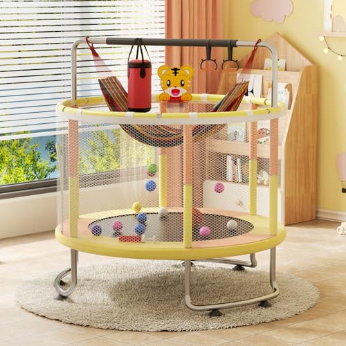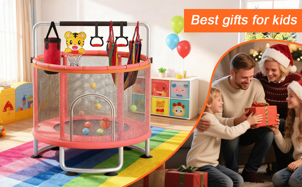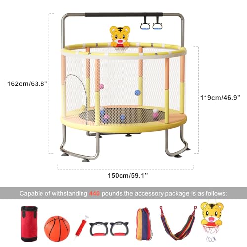 【Versatile Playtime Experience】This leisure trampoline comes with exciting accessories like a pull ring, basketball hoop, swing, sandbags, and ocean balls, providing endless entertainment for your children. Gift this amazing toddler trampoline for birthdays or Christmas, and watch your kids have a blast while staying active