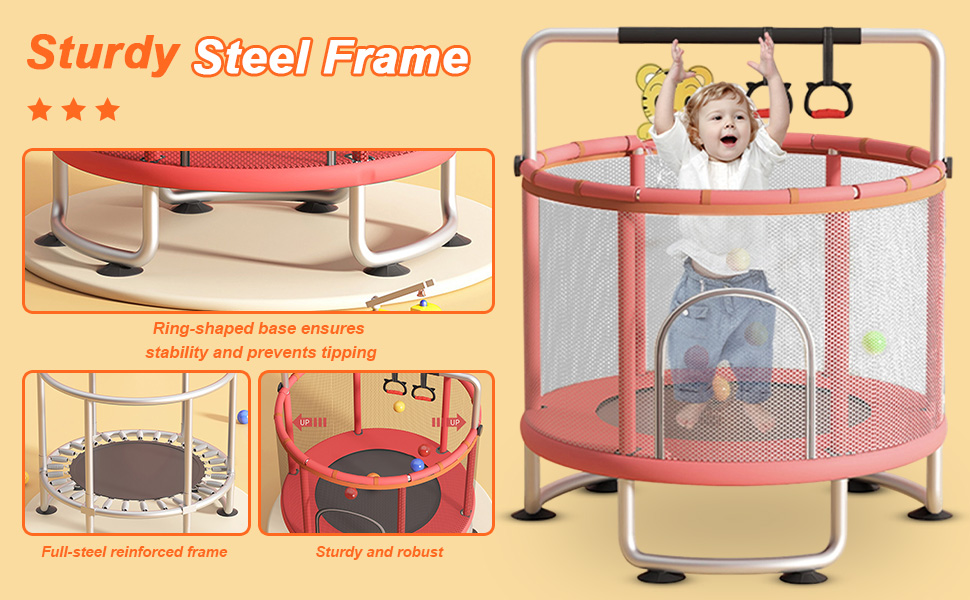 【Stable & Durable Construction】Constructed with sturdy galvanized steel, this indoor trampoline kids’ model supports up to 440 pounds. The widened U-shaped bases and two enhanced static suction cups prevent tipping, providing a safe environment for toddlers to jump freely on their trampoline for toddlers