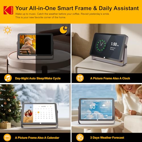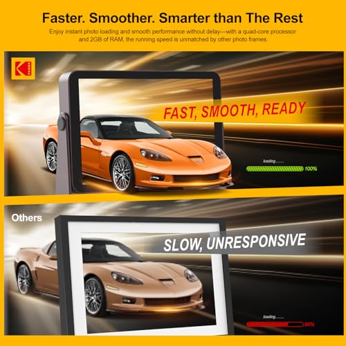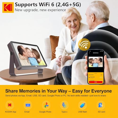 - 【Instant Wireless Sharing】 This digital photo-frame supports WiFi 6 (2.4G+5G), minimising issues with network connectivity and app pairing. The "kodak digital frame" app can be download from Google Play or Apple Store for free. No matter where you are, you can send wonderful photos to the digital photo frame wifi via app, email or Google Photo. You can invite your family member and friends to send photos and videos from anywhere, and you can enjoy them in seconds.
