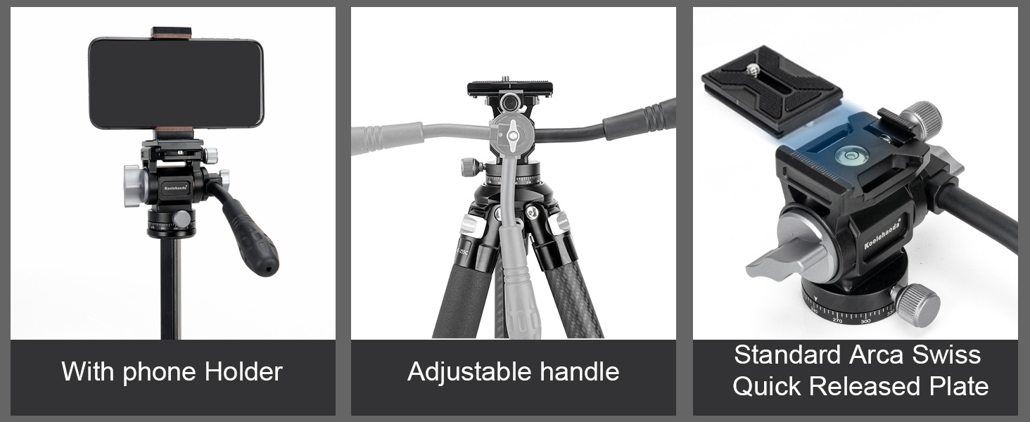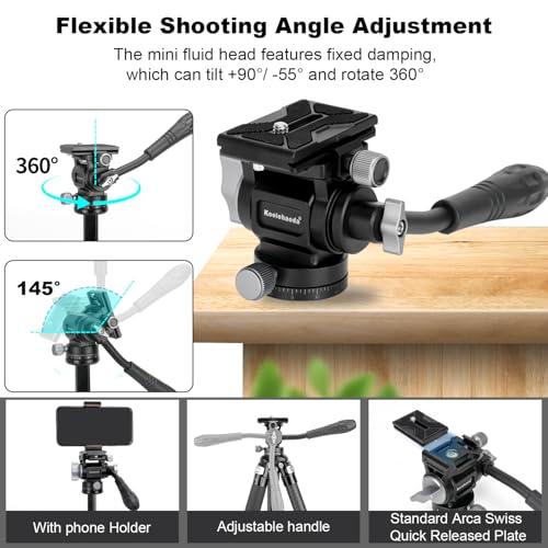 【Arca Type Compatibility Mini Fluid Head】The compact and portable mini fluid head features fixed damping to ensure smooth operation. It can tilt +90°/-55° and rotate 360°,and Equipped with a two-way adjustable handle and a quick release plate for Arca-type, It top 1/4" screw is compatible with mini DV camcorders, DSLRs, mirrorless cameras, binoculars, sliders, smartphones and more for vlogging, photography and videography
