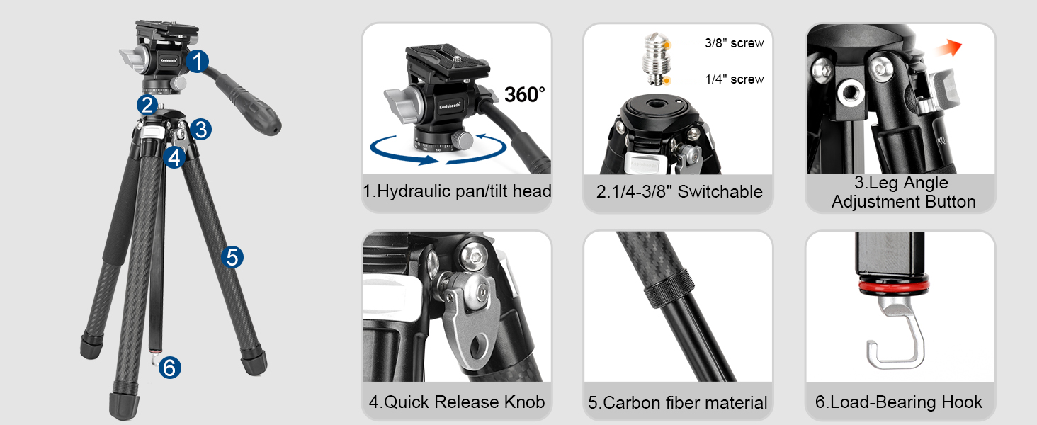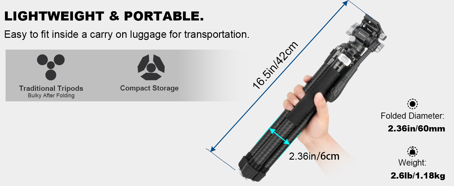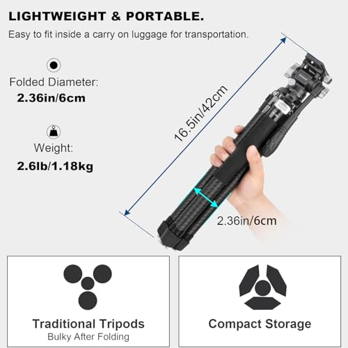 【Superior Stability Compact Travel Tripod】 Crafted from aluminum alloy and Carbon Fiber, delicately designed for videoing, live streaming, vlogging, etc. this KQ-255C portable camera tripod weighs just 2.6lb/1.18kg. Tightly fitted legs fold down to a 2.3"/6cm diameter and 16.5"/42cm length for easier single hand grip. can support devices up to 22lb/10kg(Tripod),11lb/5kg(Fluid head).