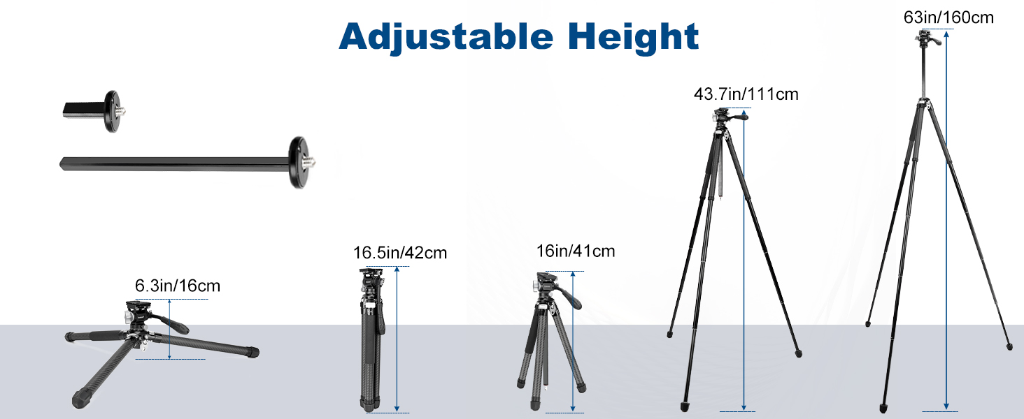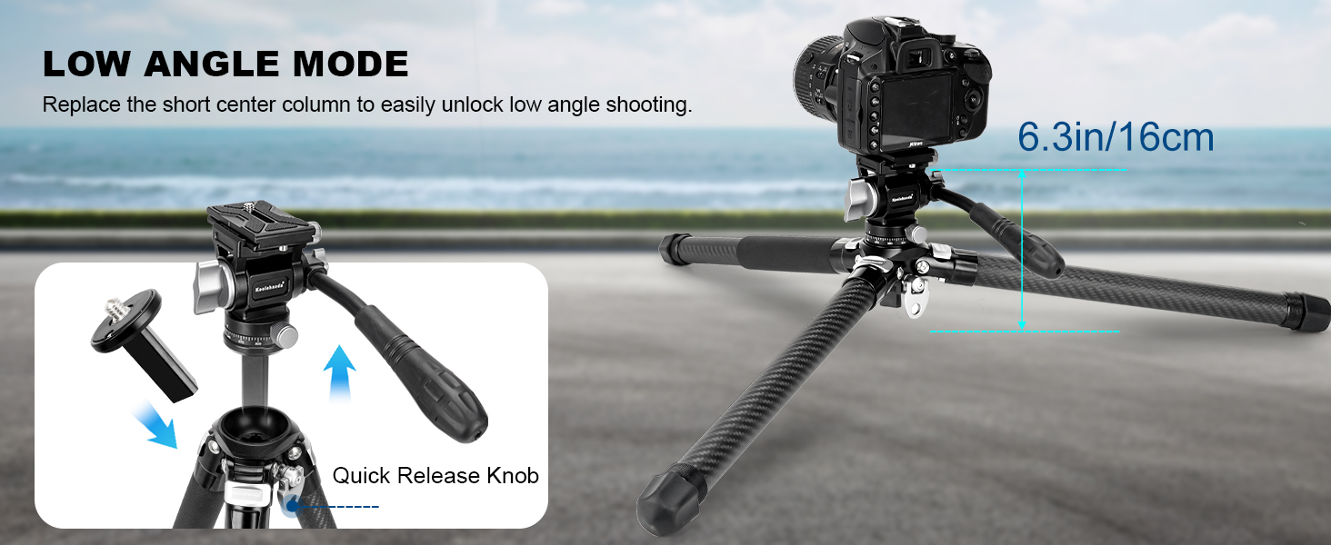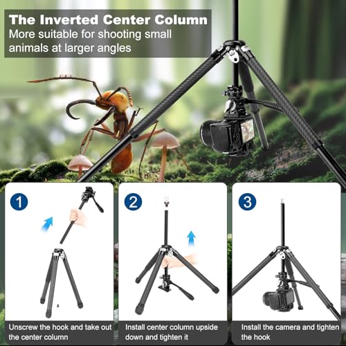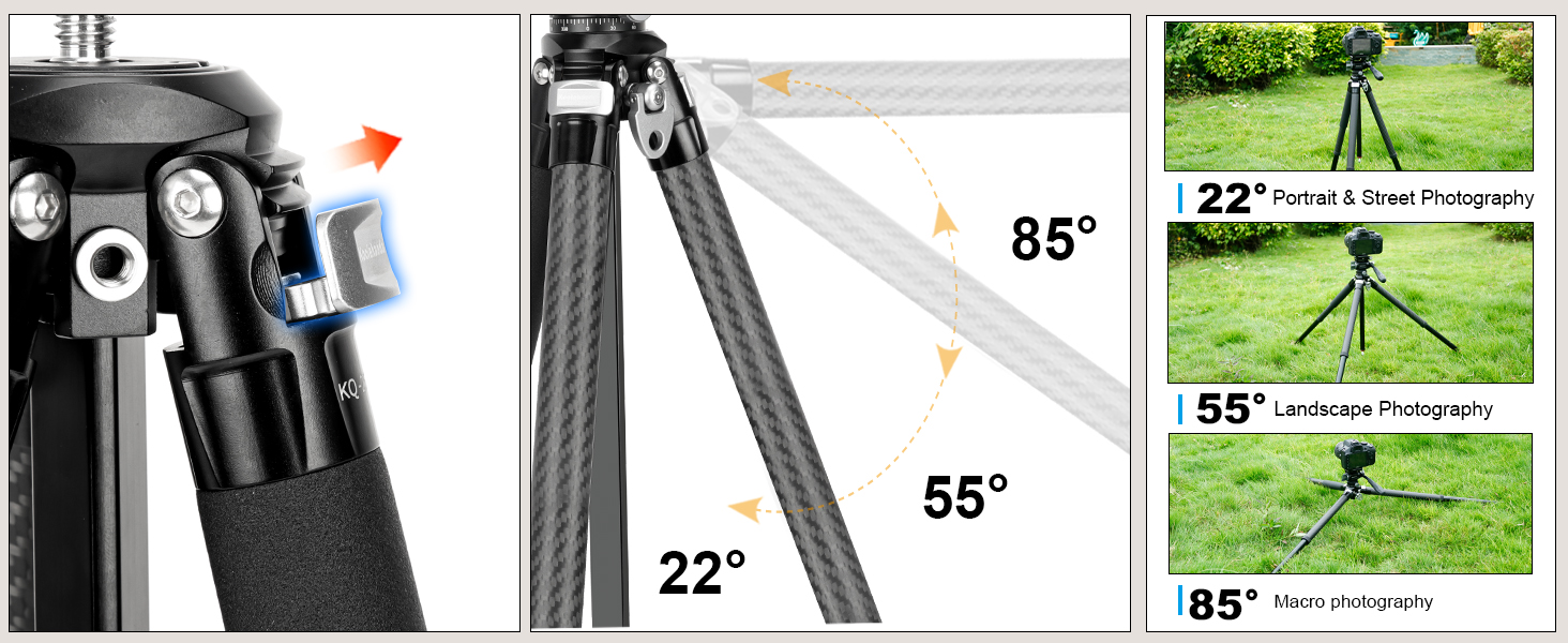 【Versatile Shooting Angles】The travel tripod has a quick angle adjustment lever, offering three angle options (23°/50°/80°) , And equipped with long center axis and ultra-short center axis. The long center column can be installed upside down to achieve macro photography, Switch to the short center column for low-angle shooting down to 6.3 in / 16 cm, providing more shooting perspectives.