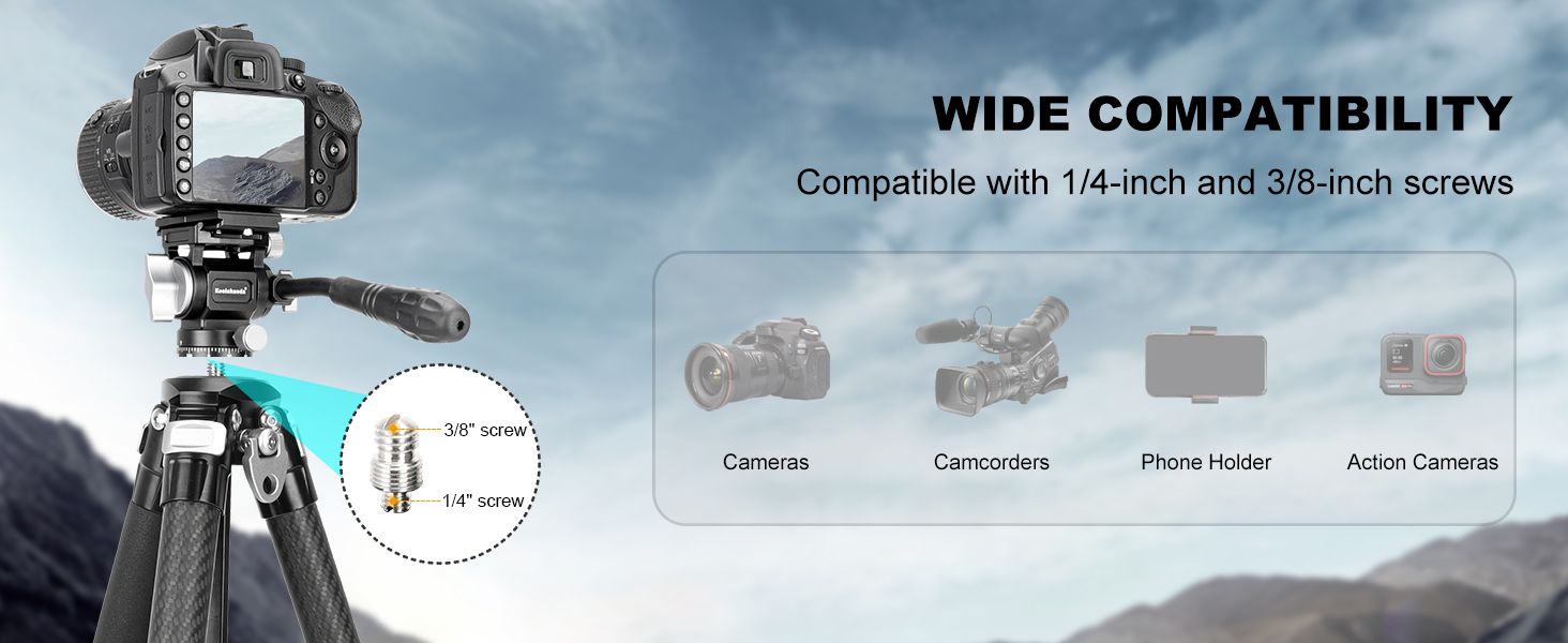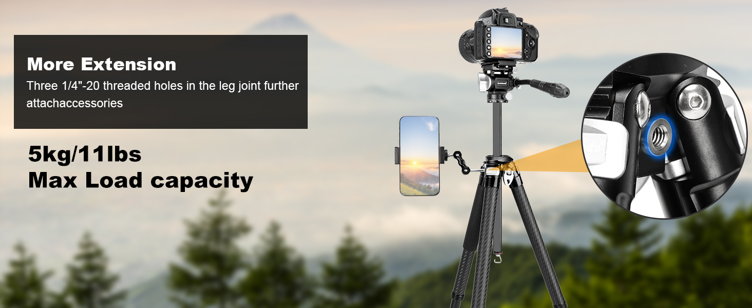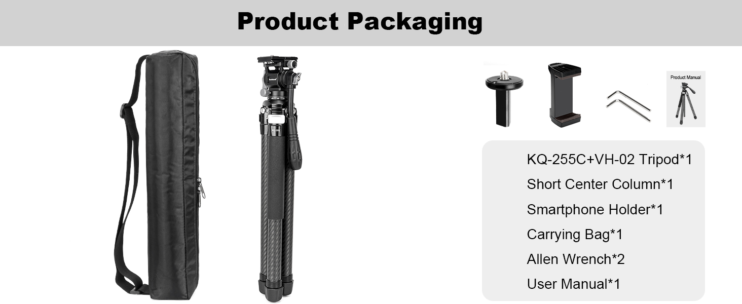 【Expandability & Package Includes】The travel camera tripod has a 1/4"-20 threaded hole that are compatible with accessories such as magic arms, allowing for the attachment of microphones, monitors, and other transmission devices. The package includes a KQ-255C Tripod*1, Short center column*1, Smartphone holder*1, Carrying bag*1, Allen wrench*2, and user manual*1.