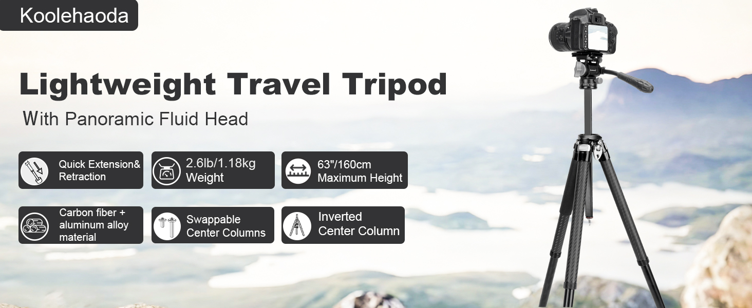 Koolehaoda Camera Tripod 63″ Lightweight Aluminum Video Travel Tripod with 360° Panorama Fluid Head, Quick Release Leg Setup for Travel, Video, Live Streaming, Vlogging