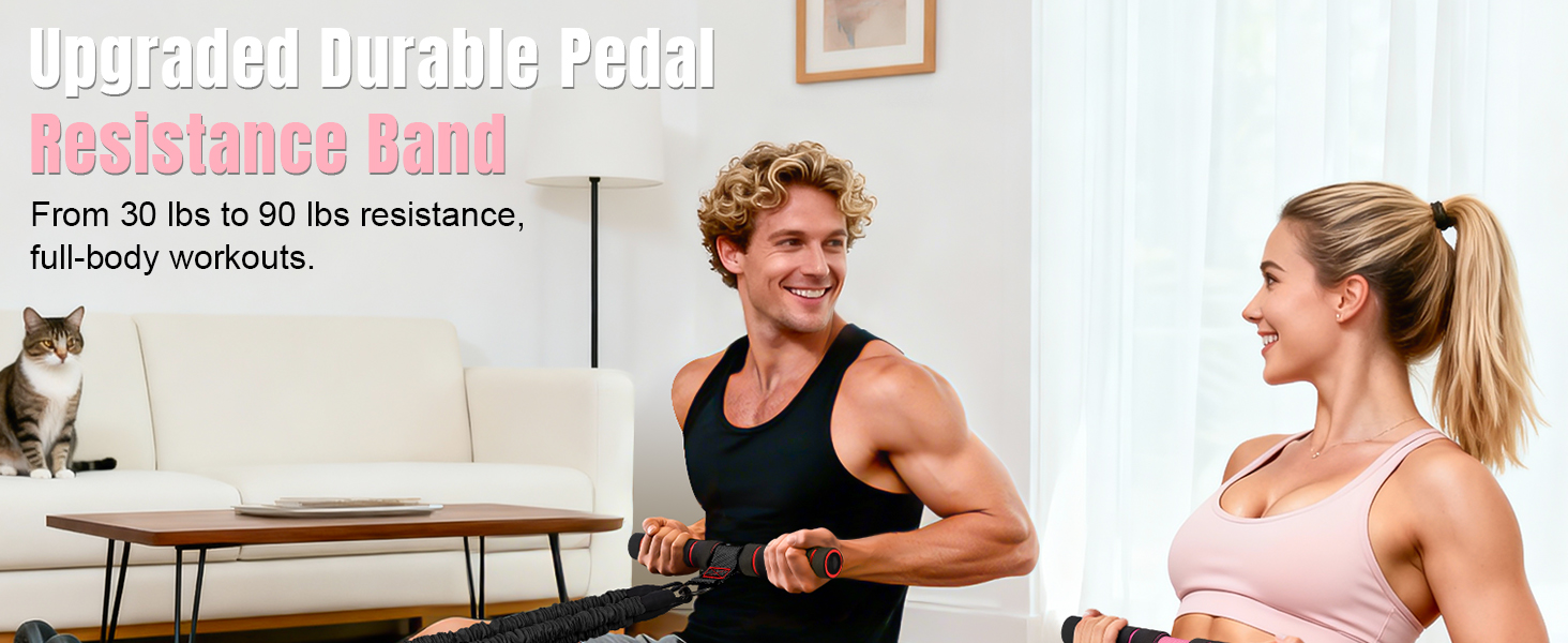 Adjustable Resistance for Full-Body Training — From 30 to 90 lbs resistance, one pedal resistance bands set supports core, arms, legs and total body workouts at home.