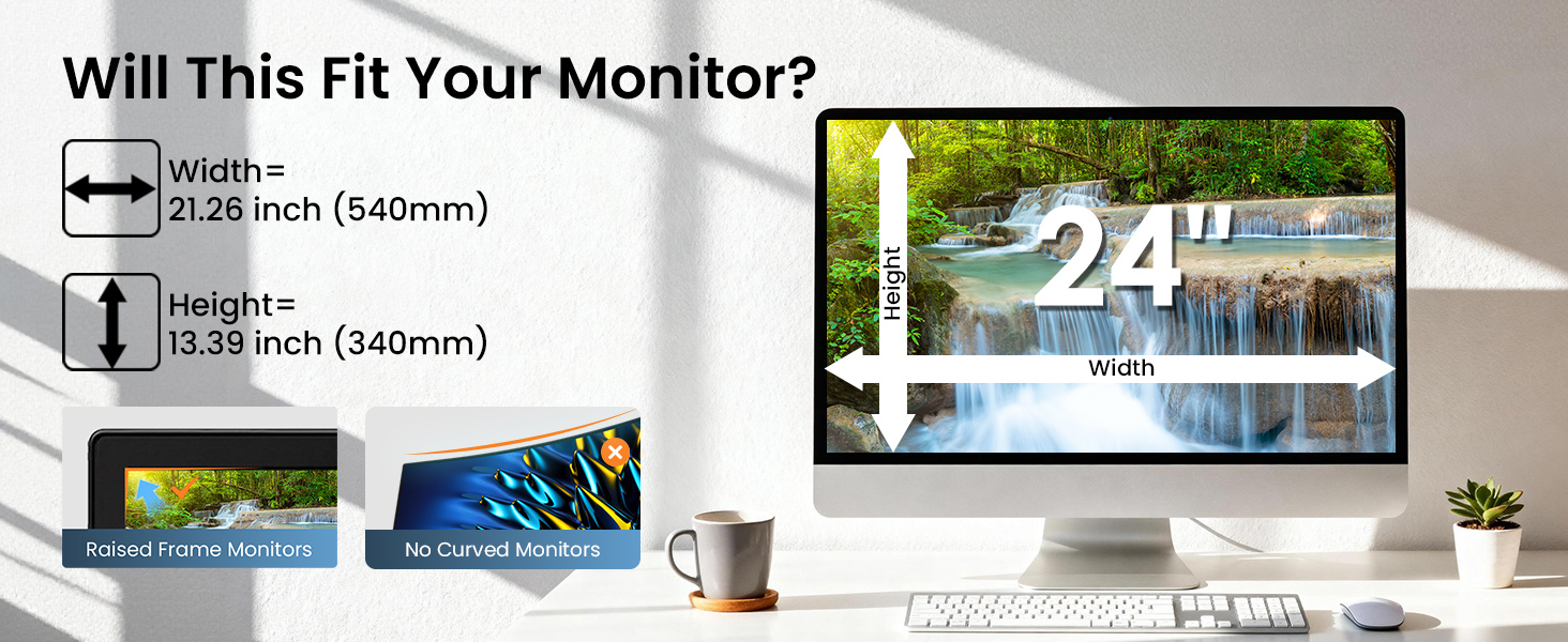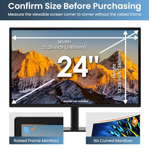 Fits 24 inch Computer Monitors: LAMA privacy screen filter fits 24 inch widescreen monitors with a 16:9 aspect ratio, width: 21.26"/540mm, height: 13.39"/340mm. Compatible with HP, Asus, Samsung, Dell, LG, Acer, ViewSonic and other 24-inch monitors. Please measure the width and height dimensions of your computer screen before ordering(excluding the bezel). If you have any questions, please contact us