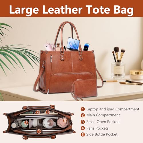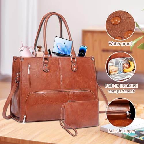 Laptop Bags for Women with Clutch Bag, 15.6 Inch PU Leather Tote Bag with Insulated Lunch Compartment, Large Ladies Laptop Handbag Shoulder Bag for Office School Business, Brow