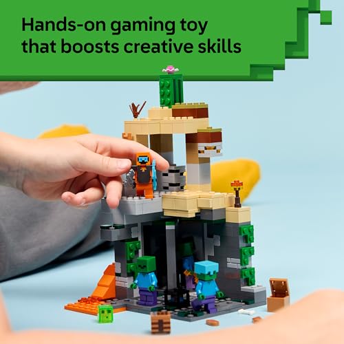 INTERACTIVE MINECRAFT TOY FOR GAMERS – This LEGO Minecraft desert biome offers hands-on features to inspire imaginative play such as a rotating, zombie-spawning chamber and sliding piece to trigger a rockfall