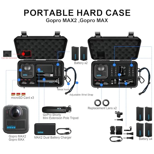 - Durable Build: The Gopro MAX 2 camera hard case features a high-impact ABS plastic exterior combined with an interior lined with premium shock-absorbing sponges,keep your Gopro MAX kits organized. against drops, scratches, and vibrations. Safeguard your Gopro Max 2 vlog camera and accessories from bumps, falls, and abrasions, whether you're on the move or in transit.