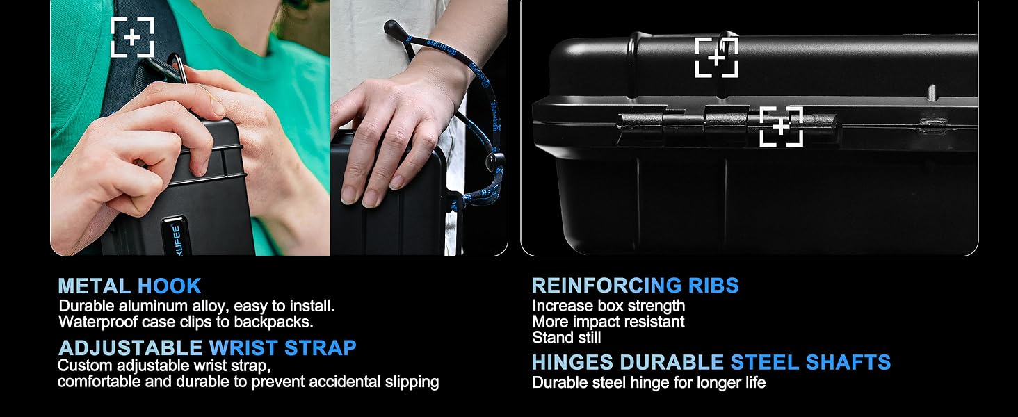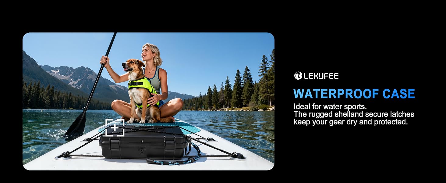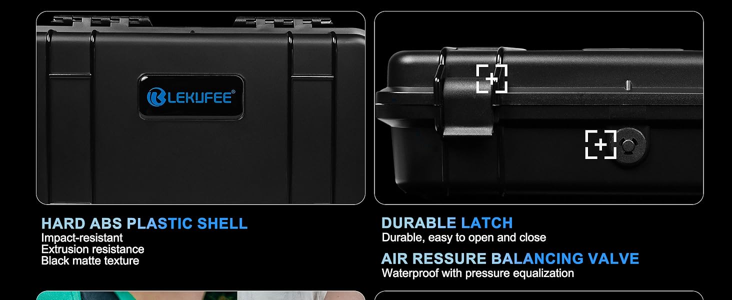 1x Lekufee Waterproof Carrying Case;1x Custom Sponges Insert.;1x Instruction Manual;1x Aluminum climbing buckle;1x Adjustable wrist strap.