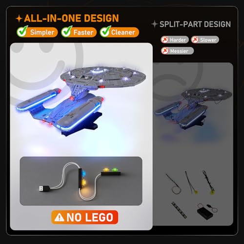 【ALL-IN-ONE DESIGN】 Easy installation with a pre-set wiring layout for Lego 10356 Star Trek: U.S.S. Enterprise NCC-1701-D, featuring a plug-and-play setup with pre-routed channels and hassle-free removal — quick to light up your model or home decor.(Model Not Included)