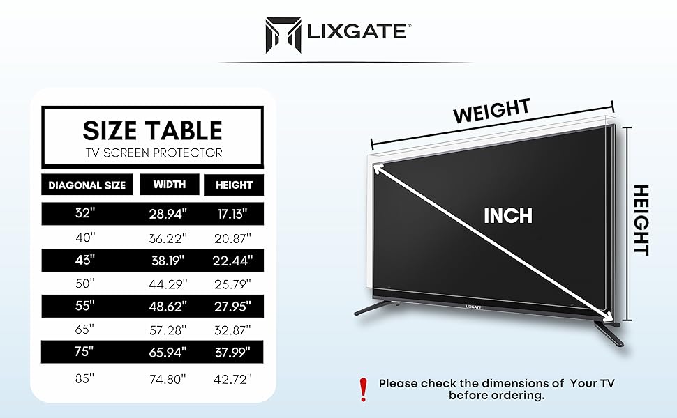 Don't guess—get the perfect fit. Our comprehensive size table covers everything from 32" to 85" screens. We provide exact Width and Height measurements to ensure full-edge coverage for your specific model. Please measure your TV's dimensions before ordering to ensure the most aesthetic and secure fit for your home theater.