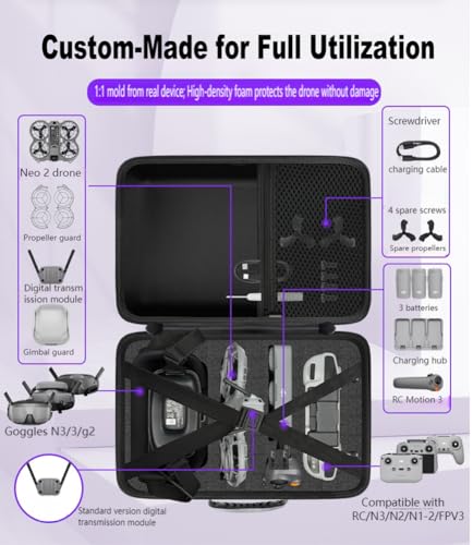 - DESIGNED FOR Neo 2 Motion Fly More Combo: The NEO 2 Case provides a custom-fit storage solution for your Neo 2 drone, Goggles N3, Motion 3 Controller, Charging Hub and other essential accessories. The 1:1 precision-cut slots keep everything securely in place.