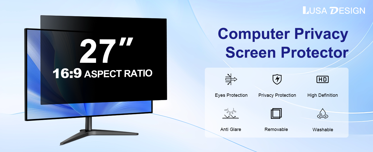 【EASY TO INSTALL】 LUSA DESIGN 27 inch monitor privacy screen has 2 uniquely designed installation methods: ① Permanent installation method-double-sided tape sticking. ② Removable installation method-snap-in installation. Suitable for computers with a raised frame, a 16:9 screen aspect ratio and a 27-inch size. Choose the method that suits you, and it can be installed in 20 seconds.