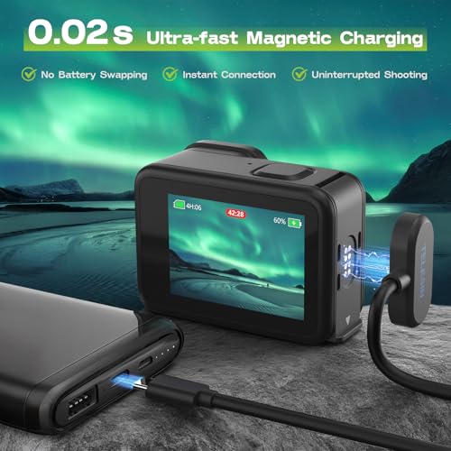 【0.02 s Magnetic Fast Charging】Revolutionary magnetic technology enables instant plug-and-play charging. Virtually no delay – for uninterrupted recording. Battery not included, only charging cable included.