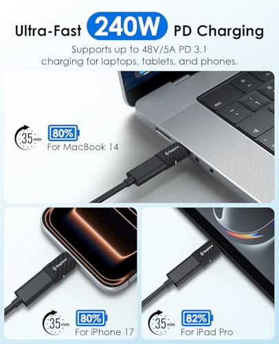 240W PD Super Fast Charging: Type-C adapter supports up to 240W Power Delivery (48V/5A) for fast laptops, tablets, and i-Phones. Compatible with USB4 / USB-C devices; indicator lights display real-time status.