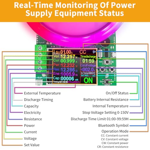 - 2.4" Large Screen Battery Load Tester: Featuring a high-definition color screen, this electronic load tester provides clear and precise readings. It offers comprehensive parameter, settings and operations, including voltage, current, power, capacity, electricity, temperature, discharge resistance, time-limited discharge and stop voltage, etc., to ensure accurate and reliable results.