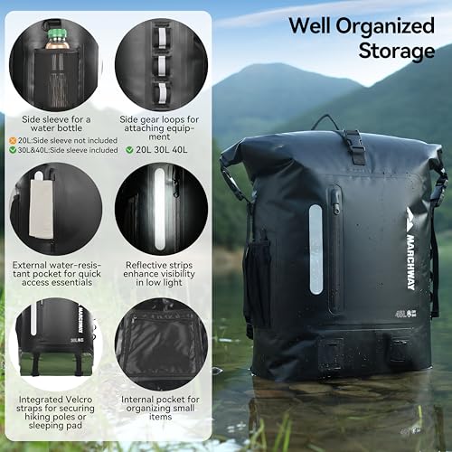 MARCHWAY Roll Top Waterproof Backpack, Floating Dry Bag 20L/30L/45L with Ergonomic Rectangular Base, Cushioned Back, Hip Strap, Gear Loops, MOLLE for Hiking Camping Kayaking Travel (Black, 20L)