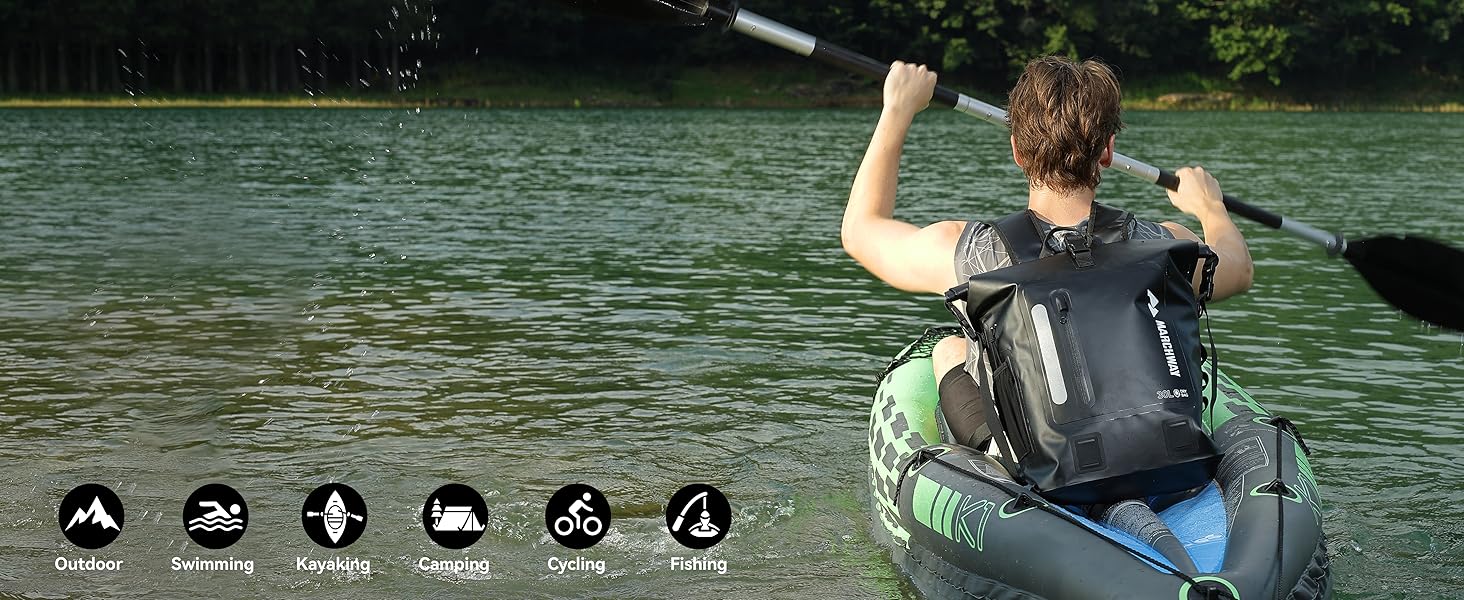 - Versatile Utility: Its floatation capability during water sports enables quick retrieval. Front and rear reflective strips enhance low light visibility. With minimalist aesthetics, ample capacity and proven waterproofing, it transitions seamlessly from urban commutes to outdoor adventures, serving as your reliable companion for trekking, backpacking, boating, sailing, canoeing, fishing, hunting, beach.