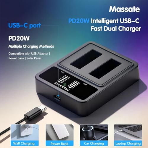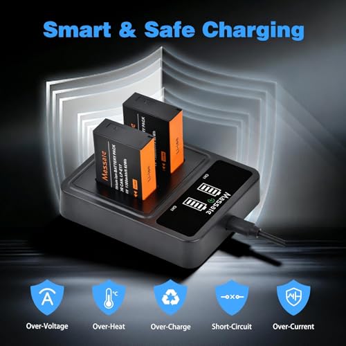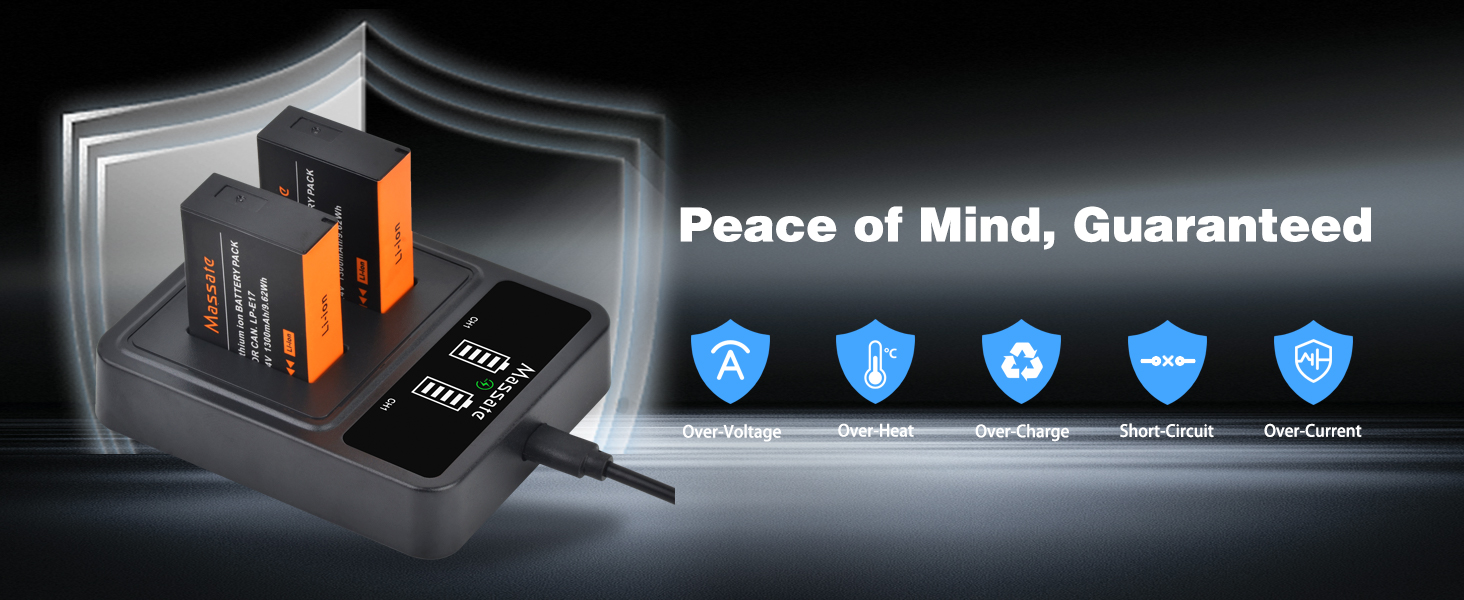【Pro-Grade Protection Circuitry】Massate LED rapid dual charger with integrated safeguards against over-charging, over-discharging, over-current, and short circuits, ensures both battery and device safety. The LP-E17 battery charger further enhances this with regulated voltage output and temperature control. It delivers an extended lithium batteries lifespan, guaranteed equipment safety, and the confidence to charge reliably anywhere