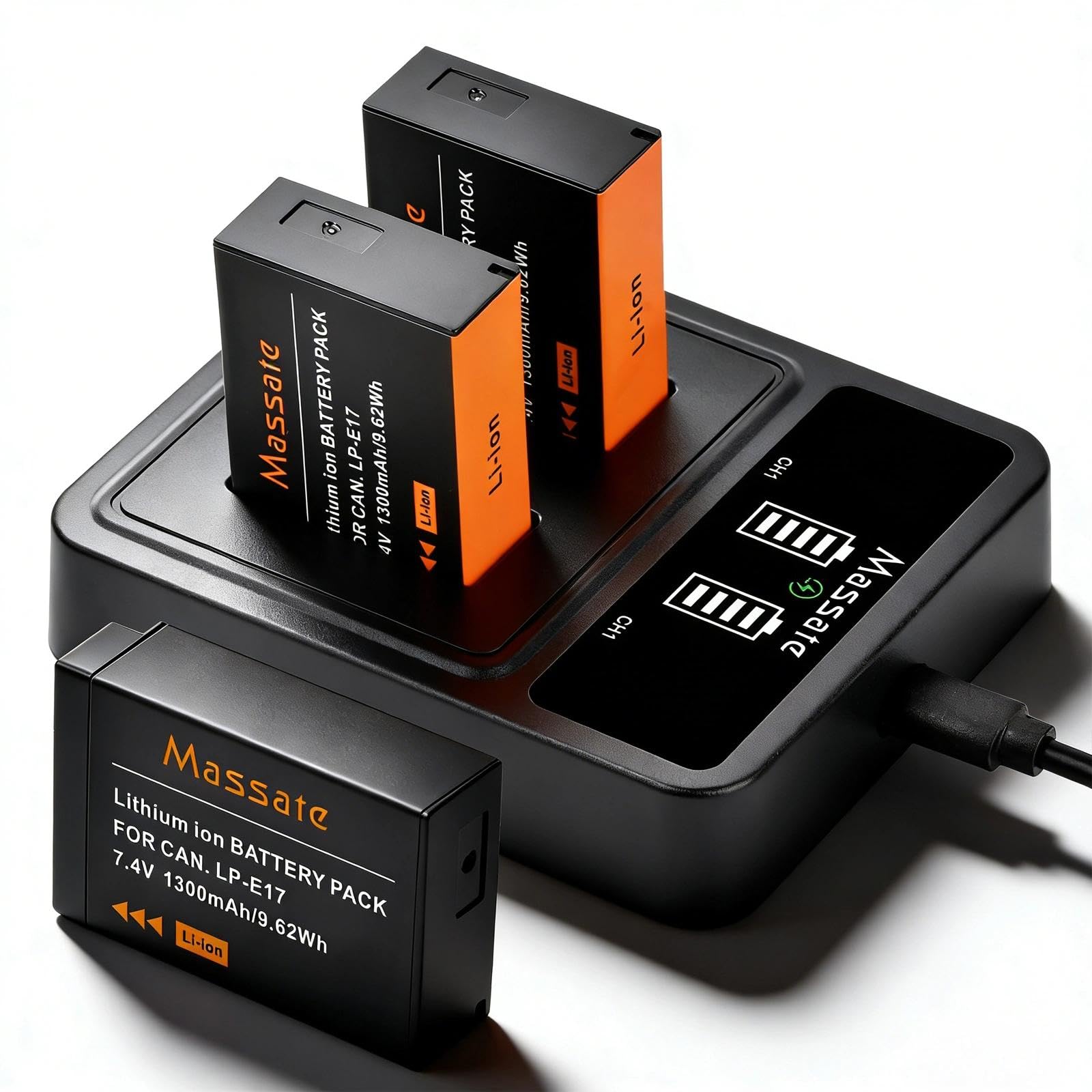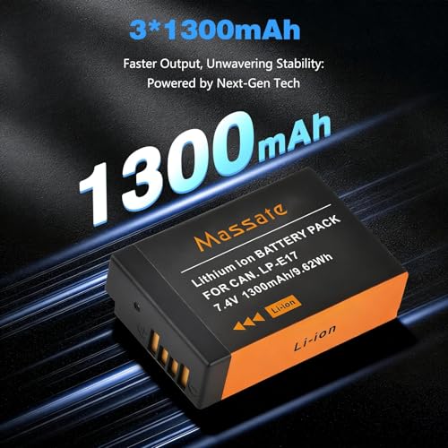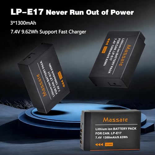 【3-Battery Max-Performance Set】Say goodbye to power constraints. The Massate 3-pack LP-E17 Battery kit, featuring 1300mAh cells (7.4V/9.62Wh each), each powerhouse replacement for Canon battery LP-E17 is engineered to outperform, providing significantly longer per-charge life. The combined capacity ensures you can shoot all day, capturing thousands of photos or hours of video without interruption