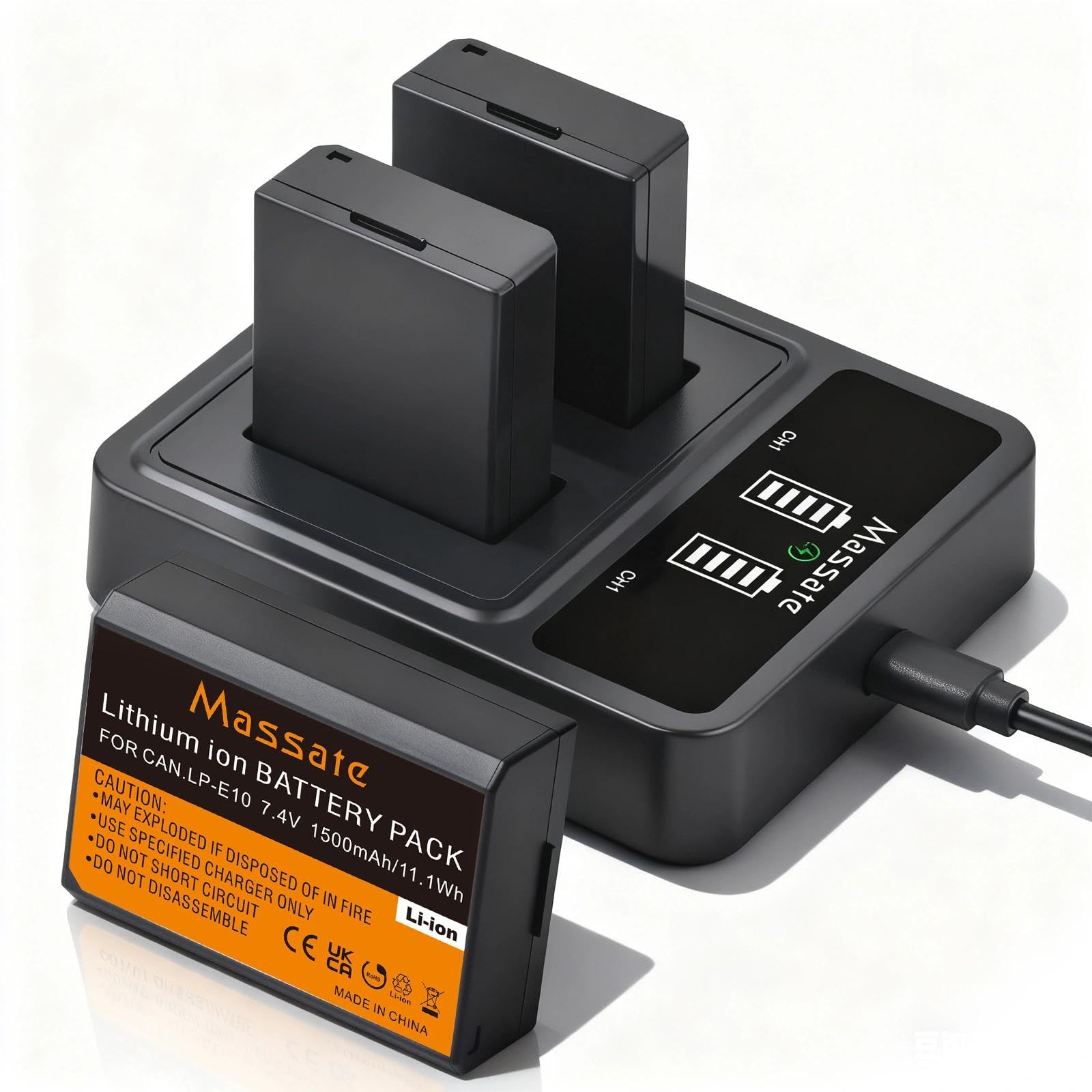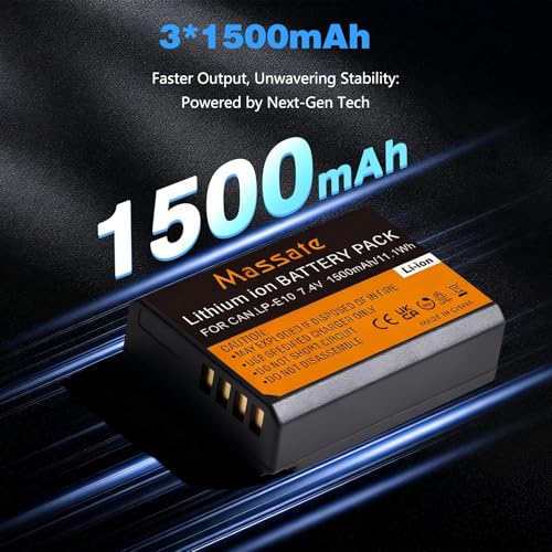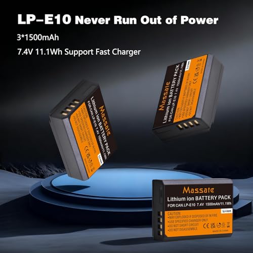【3-Battery Max-Performance Set】Say goodbye to power constraints. The Massate 3-pack LP-E10 Battery kit, featuring 1500mAh cells (7.4V/11.1Wh each), each powerhouse replacement for Canon LP-E10 battery is engineered to outperform, providing significantly longer per-charge life. The combined capacity ensures you can shoot all day, capturing thousands of photos or hours of video without interruption