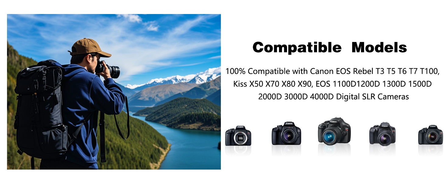【Universal LP-E10 Compatibility】Your Trusted Power Backup, Guaranteed. This Replacement for Canon battery LP-E10 is engineered to be a seamless, high-performance replacement and is fully compatible with all Canon cameras that use the original LPE10 batteries.——Fully compatible with Canon EOS Rebel T3 T5 T6 T7 T100, Kiss X50 X70 X80 X90, EOS 1100D 1200D 1300D 1500D 2000D 3000D 4000D Digital SLR Cameras(NOTE: THIS BATTERY NOT WORK WITH T3i, T5i, T6i, T7i)