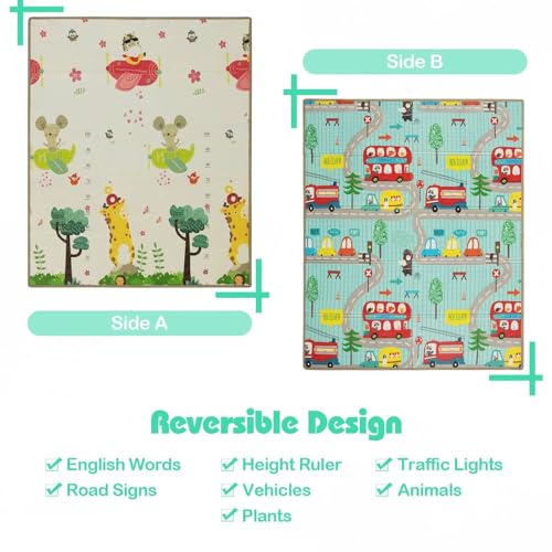 Reversible Graphics for Learning: This baby activity mat features 2 sides decorated with colorful, eye-catching patterns such as English letters, animals, traffic motifs, and a height chart. These designs stimulate sensory awareness and encourage cognitive development in young children.