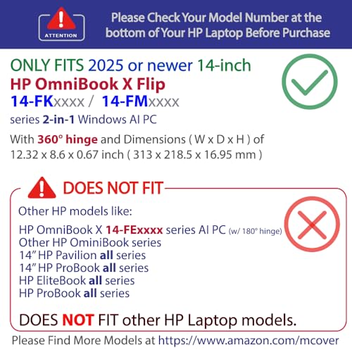 Designed to perfectly fit the 2025 or newer 14" HP OmniBook X Flip 14-FMxxxx / 14-FKxxxx series 2-in-1(with the 360° hinge) Windows AI PC Laptop with dimension of 12.32 x 8.6 x 0.67 inch ( 313 x 218.5 x 16.95 mm )
