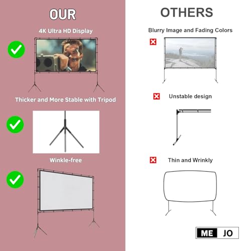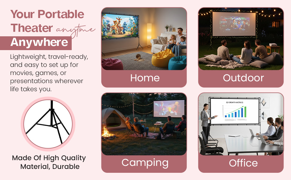 - Lightweight & Foldable – Travel-Ready Design: Easily folds down for compact storage and transportation . Whether you're heading to the backyard for outdoor movie screen, camping trip, or business meeting, this projection screen with stand is designed to go wherever you go.