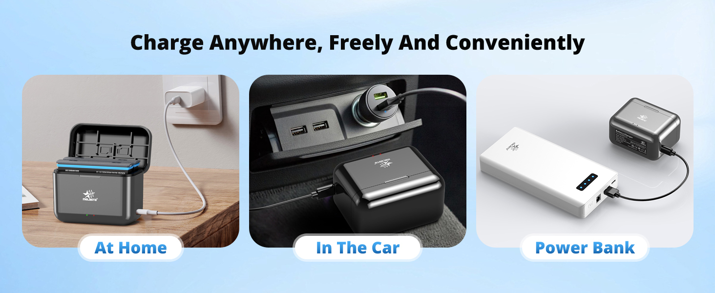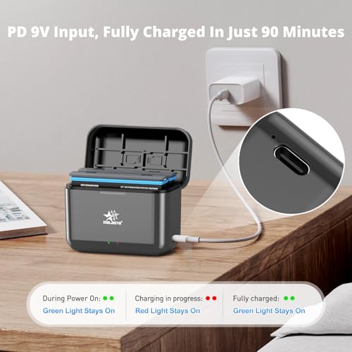 - 2-channel fast charger for Insta360 X5 battery: Fast charger hub with USB C connection, only suitable for the Insta360 x5 action camera. Fireproof material, battery charging is safer, portable and easy to transport. PD3.0/PD2.0 fast charging, full charge in 90 minutes. Red light indicates charging, green light indicates full charge. Can charge 2 batteries simultaneously and independently.