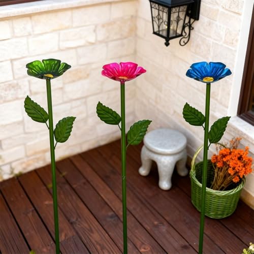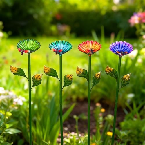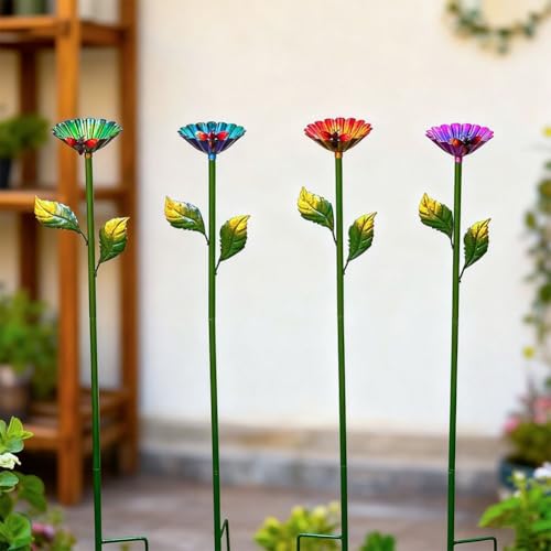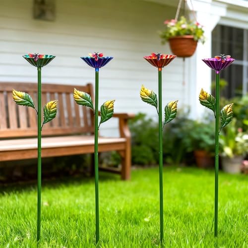 - [Eye-Catching 4-Color Garden Decoration]: This set includes four brilliantly colored metal flower stakes in gold, pink, green, and blue that add visual interest and personality to any garden landscape. The flower-shaped cups combined with realistic leaf details create an artistic focal point that complements flowers, shrubs, and pathways. These decorative accents -enliven plain spaces and maintain their vibrant appearance throughout the seasons, making your garden more inviting and aesthetically pleasing.