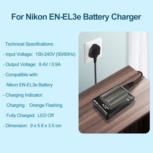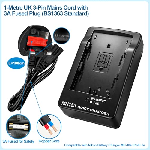 - BS1363-Certified UK Plug – Includes a 1-metre 3-pin UK mains cable with 3A fuse plug for stable, safe charging worldwide, and protection against short circuits, for Nikon EN-EL3e battery charger.
