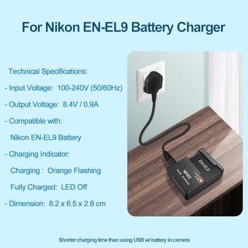 - MH-23 Charger Power – Input: AC100-240V/50-60Hz 0.25A, Output: DC 8.4V 0.9A. Provides a safe, fast and efficient charge for EN-EL9 EN-E9a battery, fit for travel, home or office, idea for great for travel photographers, vloggers and video photographer