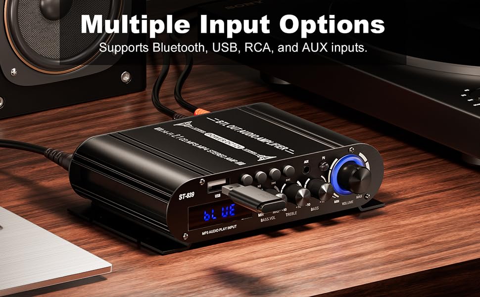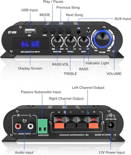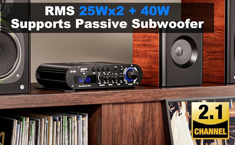 2.1 Channel Amplifier With subwoofer out — Super bass Peak power 400 Watt, Rate power of 25 * 2 Watt, and a passive 40 Watt subwoofer simultaneously.Supports speakers 2-8 Ohm Impedance allows you to enjoy high-quality audio.