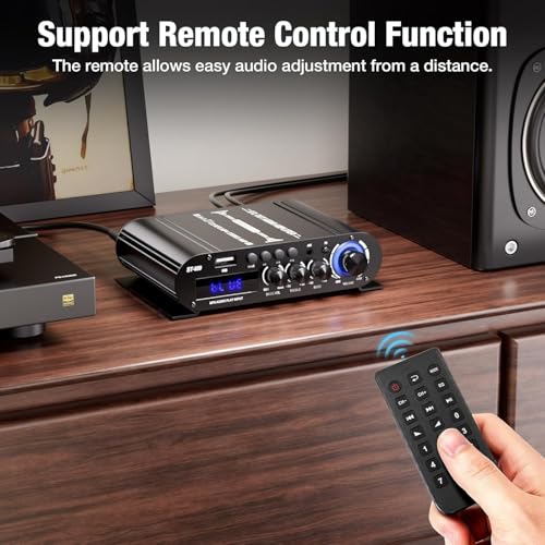 Bluetooth Amplfiier 5.0 Compact and Powerful Mini Bluetooth Amplifier wireless System — Bluetooth 5.0 for Wireless Audio Streaming, Qualify and Stable. Offers Stable High-Quality Connection. RCA audio input, Works with your favorite devices (works with iPhone, Android, Smartphone, iPad, Tablet, PC, TV, MP3 MP4 DVD VCD, etc.).