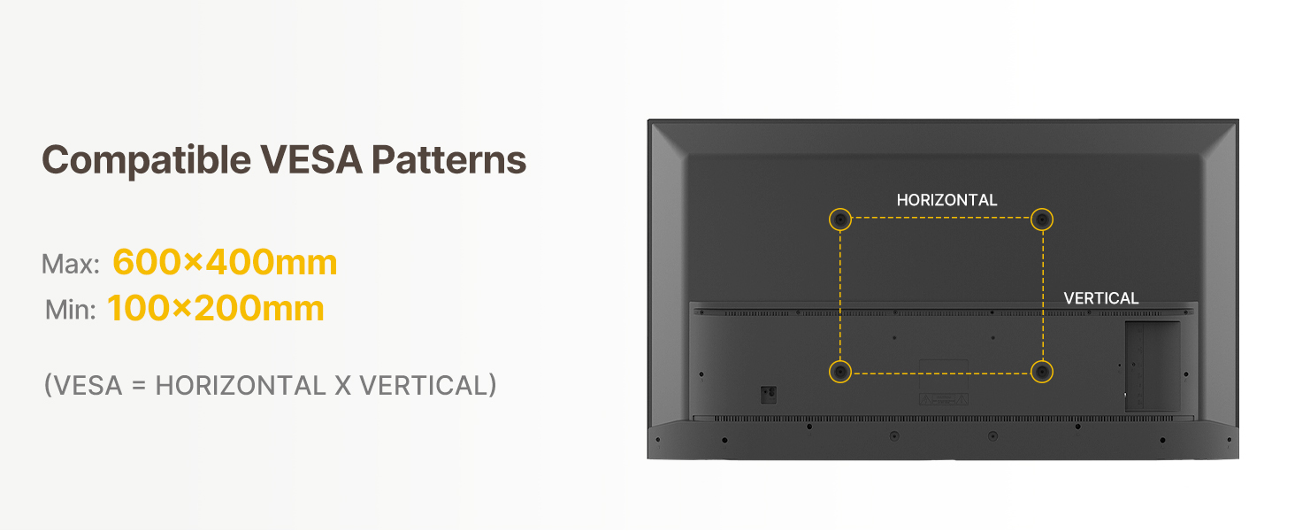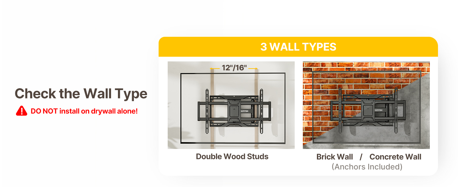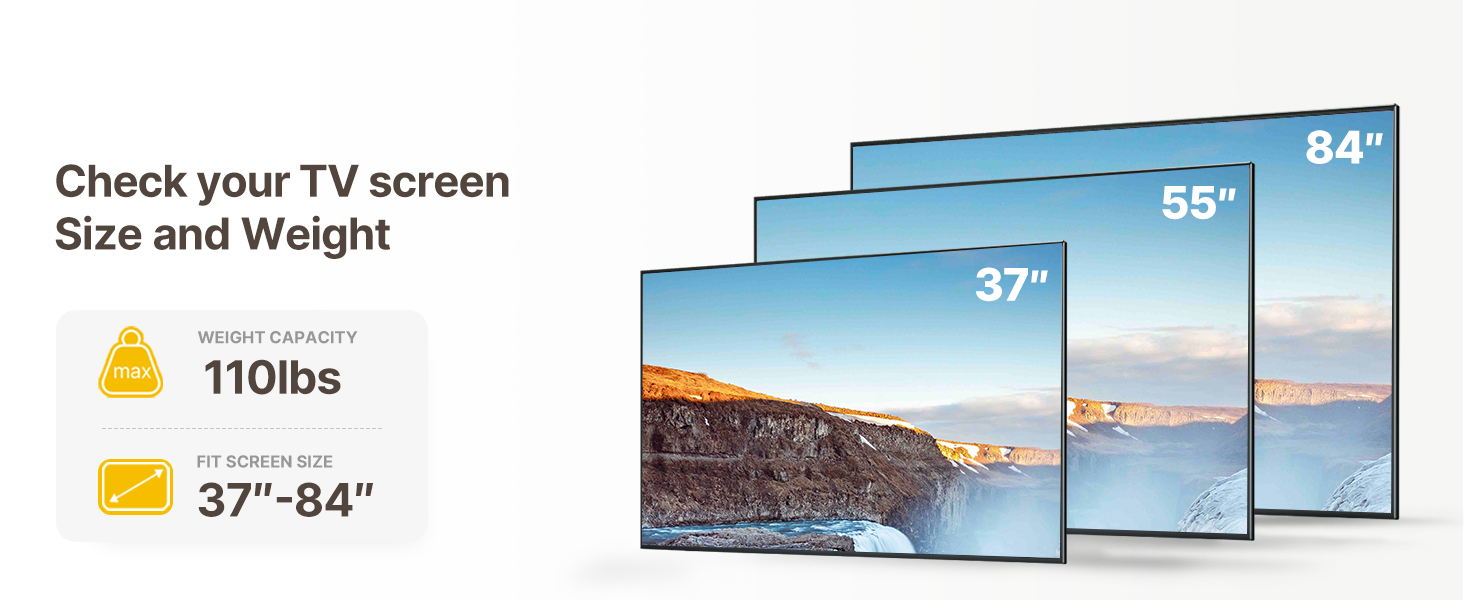 - 【FITS 37"-84" TVs – STRONG COMPATIBILITY】 This TV bracket fits most 37–84 inch flat and curved TVs with VESA patterns from 200×100 to 600x400mm, compatible with Samsung, LG, Sony, TCL, and more. Supports 12”/16" wood studs, concrete, and solid brick walls. (Please DO NOT mount on drywall alone!). Ideal for upgrading your living room, home theater, or office