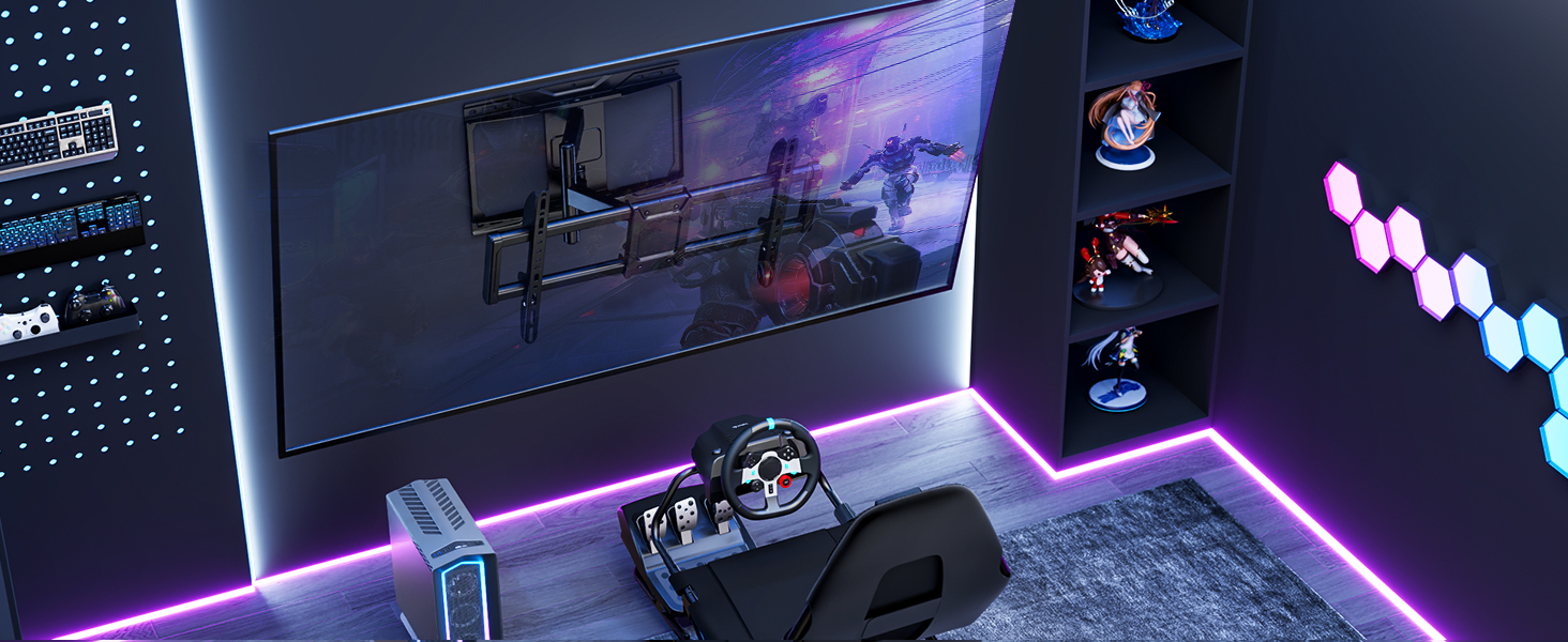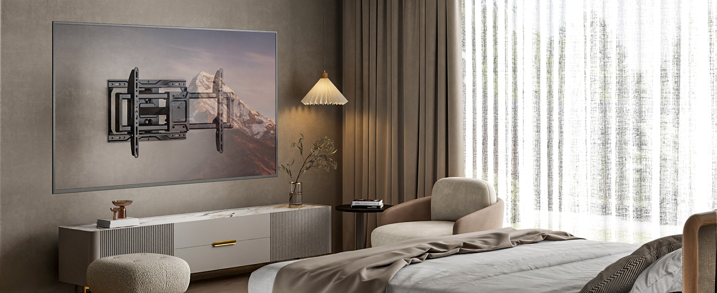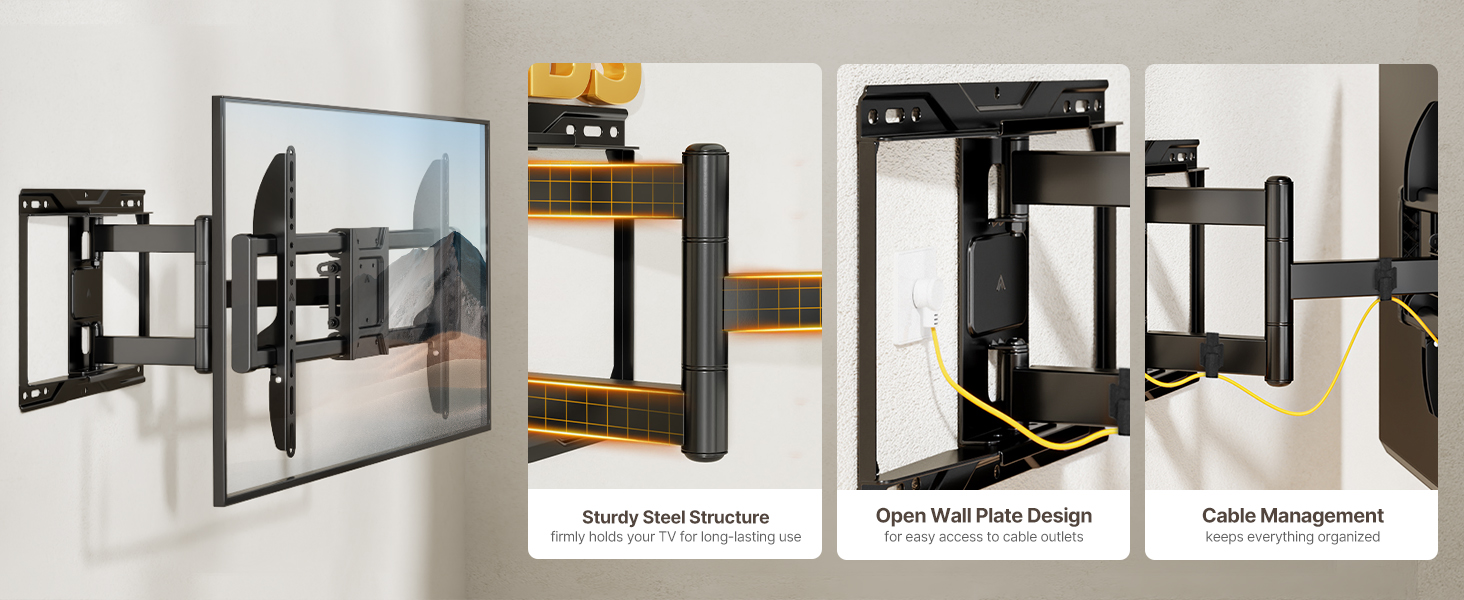- 【SPACE-OPTIMIZED & CABLE-READY】Corner tv bracket extends up to 16.6" for immersive viewing and retracts to just 2.75" for a sleek, space-saving finish. Ideal for modern, minimalist setups, universal tv wall bracket includes Velcro cable management straps to keep cords neat and out of sight. Enjoy a clean, organized entertainment area without compromising flexibility or function – perfect for modern minimalist homes