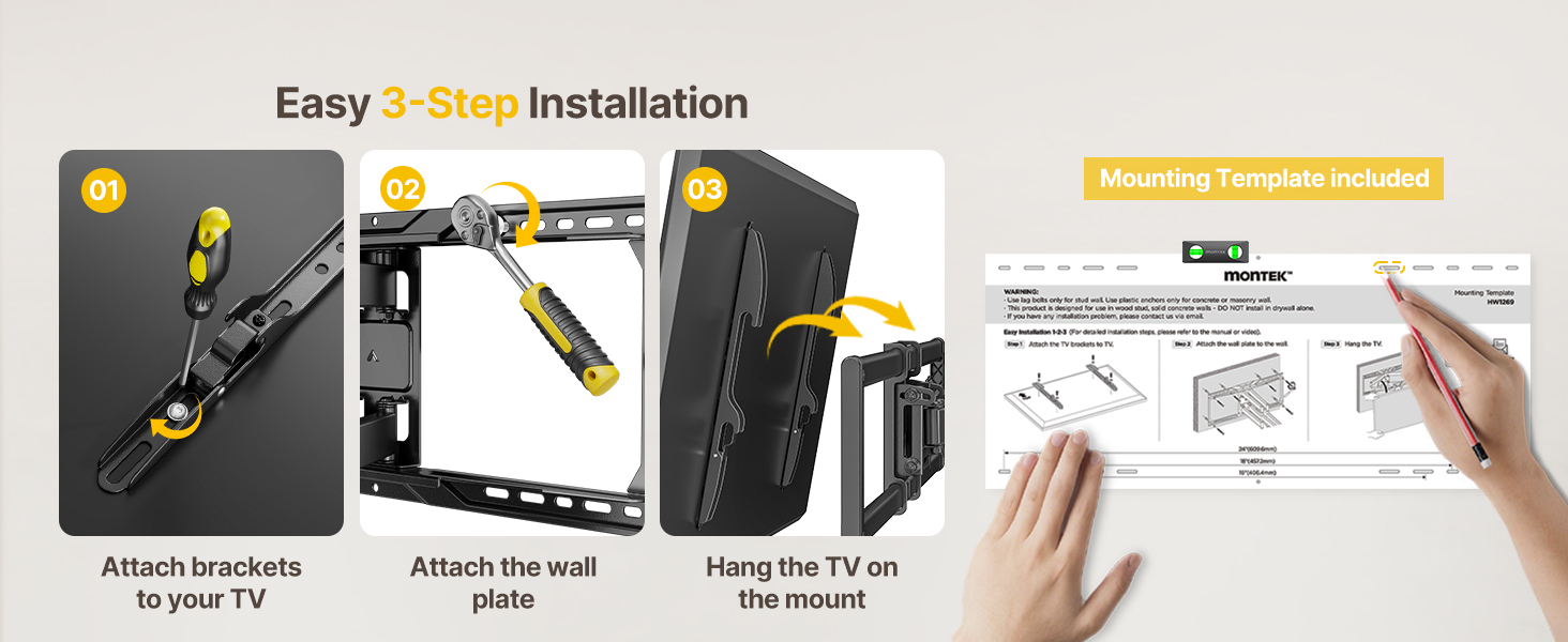 - 【4X LOAD TESTED HEAVY-DUTY SUPPORT】 This TV mount is engineered with a reinforced 3-arm articulating design that securely supports 40 42 43 50 55 65 70 75 77 80 83 inch TVs up to 110 lbs (50kg)—even for ultra-heavy 60kg displays. Backed by a 4X strength load test, swivel tv wall bracket ensures rock-solid stability and safety. Unlike bulky 6-arm brackets that limit flexibility, monTEK’s slim yet powerful structure offers superior durability while allowing full-motion flexibility. Perfect for users who want both robust support and full-motion performance in one sleek 75 inch tv wall bracket
