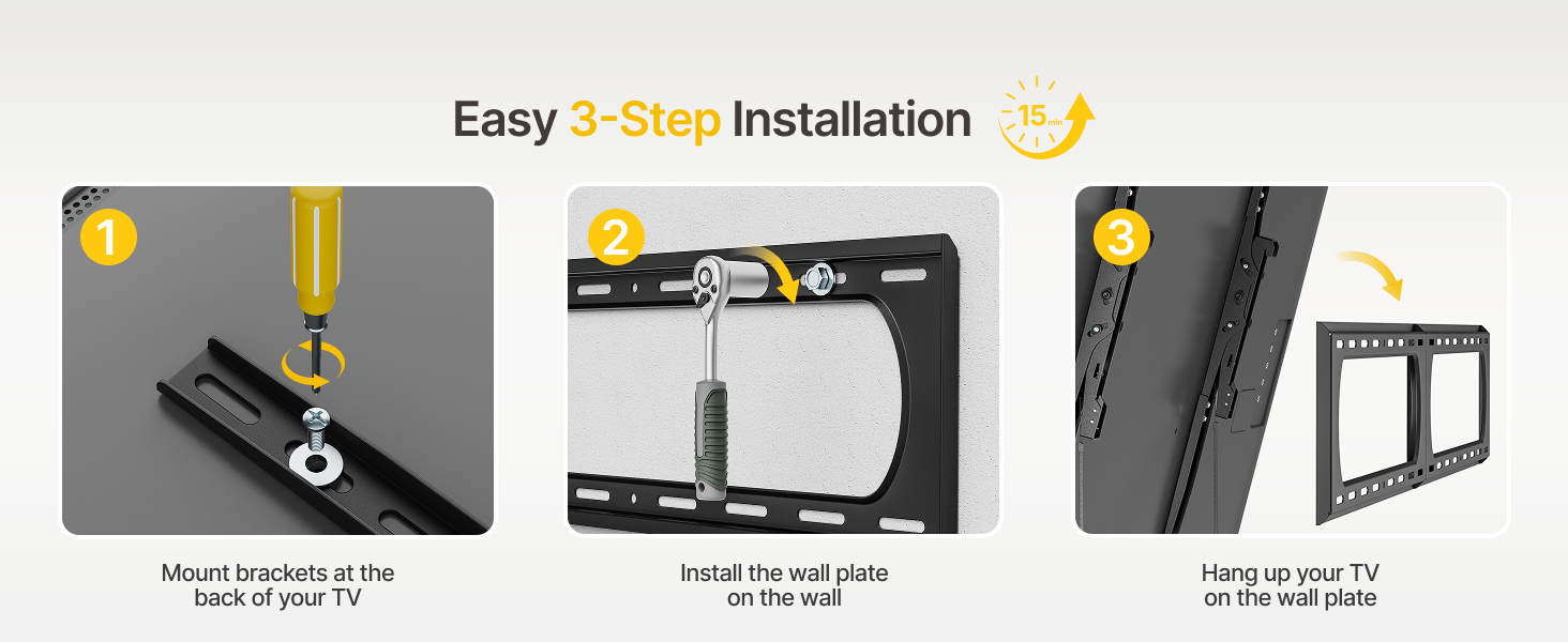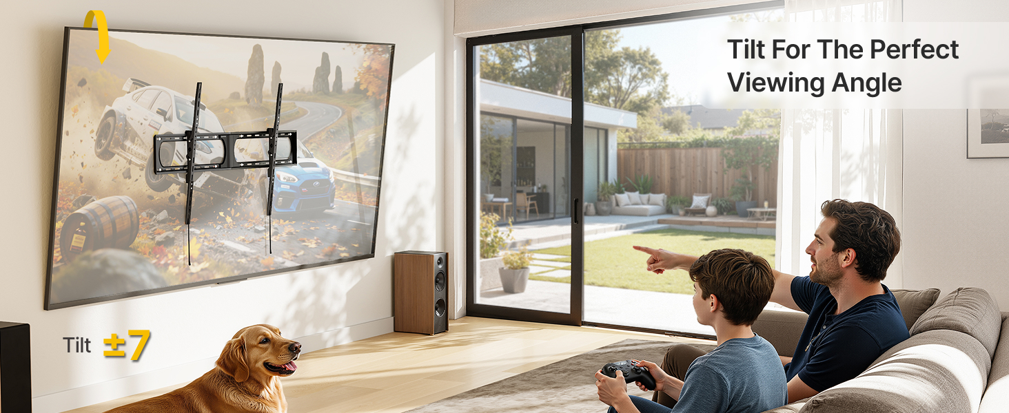 [TOOL-FREE 14° TILT ADJUSTMENT] This wall tv bracket offers tool-free ±7° tilt adjustment (14° range) to easily counteract window glare or elevated mounting positions, delivering reduced neck strain and a clearer picture for a more comfortable experience.