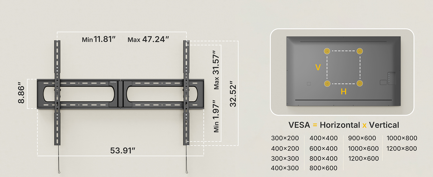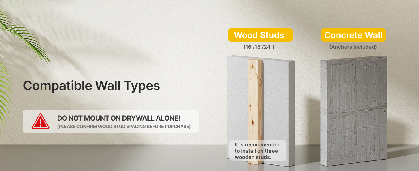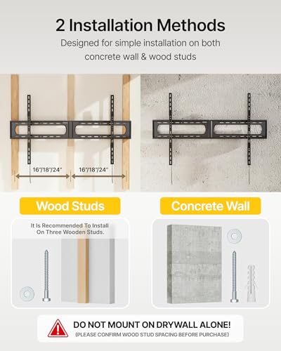 [3-STUD REINFORCED WALL MOUNT] This large wall mount tv bracket supports horizontal adjustment so you can shift your TV left or right to perfectly center it, even when studs are off-center. Built with a reinforced 3-stud design (16”/18”/24” spacing), it delivers exceptional stability for oversized TVs. Important: Must be installed across three wood studs. Drywall-only installation is not supported.