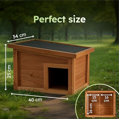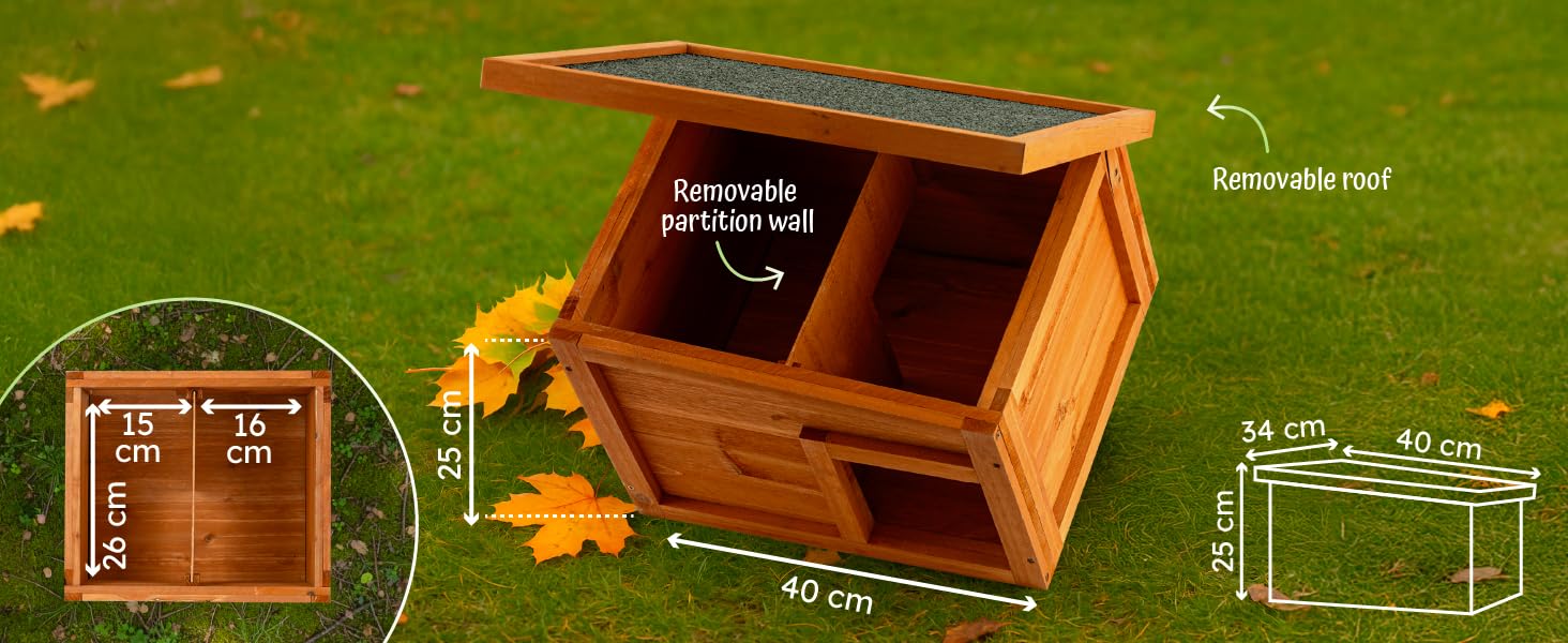- – – – Made from sustainable FSC timber, this weatherproof hedgehog house is built to last. The felt-covered, removable roof keeps out rain and cold, while its rustic look blends naturally into your garden environment.