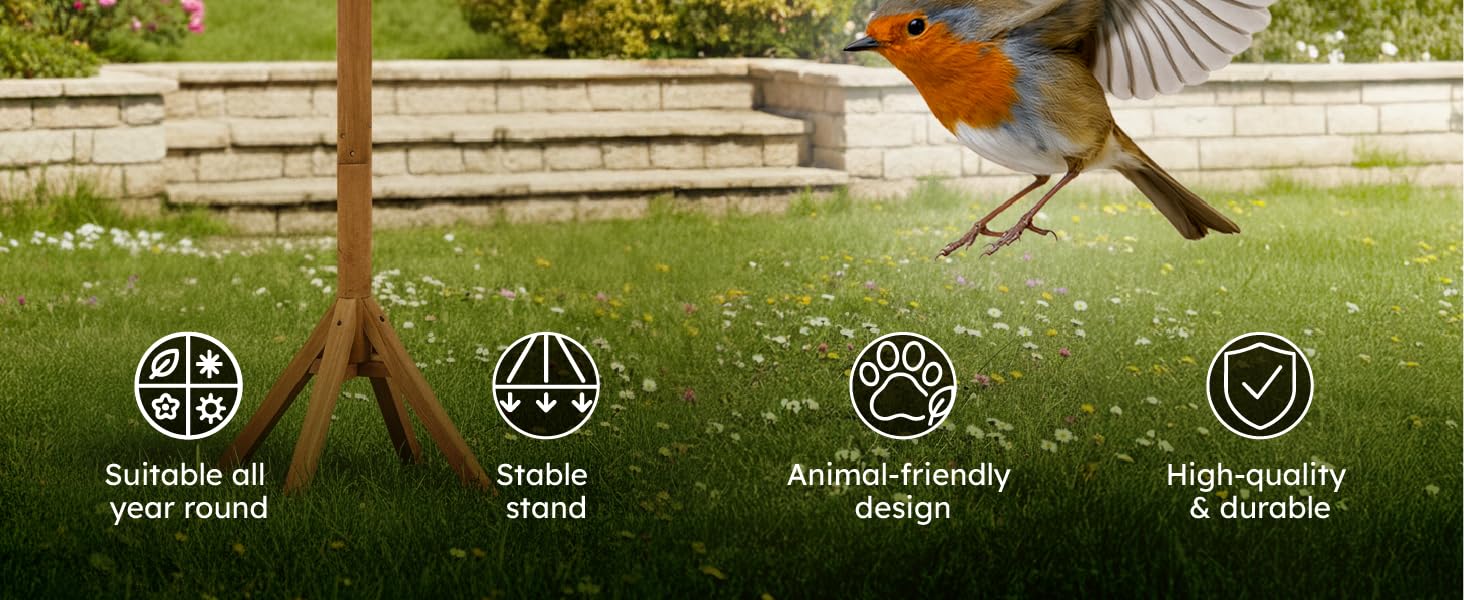 - – Designed as a freestanding bird house with a hight of 101 cm, this feeder comfortably accommodates multiple small to medium birds. Perfect as a robin nest box, sparrow nest box, or even a general nesting box for wild birds, encouraging beautiful birdwatching moments.