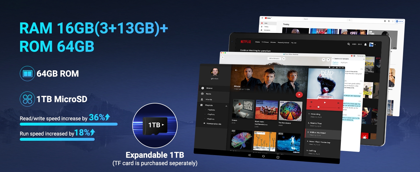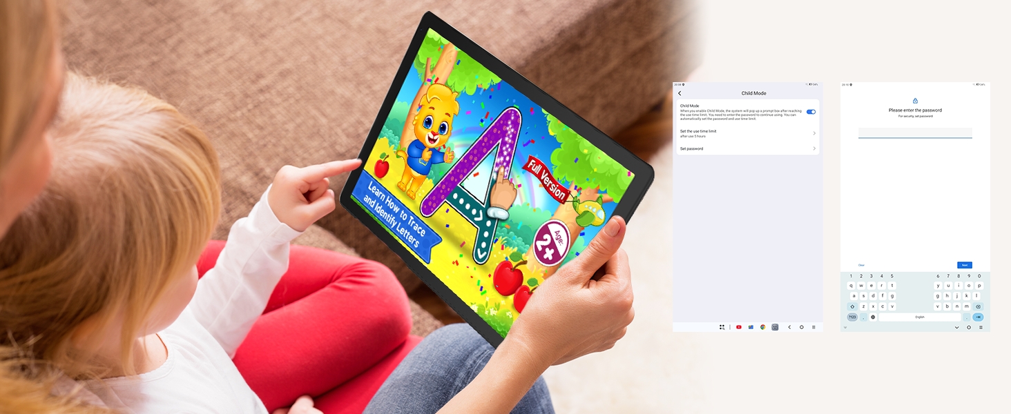 【16GB RAM+32GB ROM+1TB Expandable】 The Android 15 tablet PC built-in a powerful storage combination of 16GB RAM(3GB+13GB achieved through expansion technology) and 32GB ROM with support expansion to 1TB for TF SD card (not included). The extremely large RAM offers plenty of space for running apps as well as downloading and storing photos, movies and games.