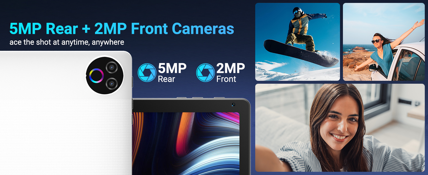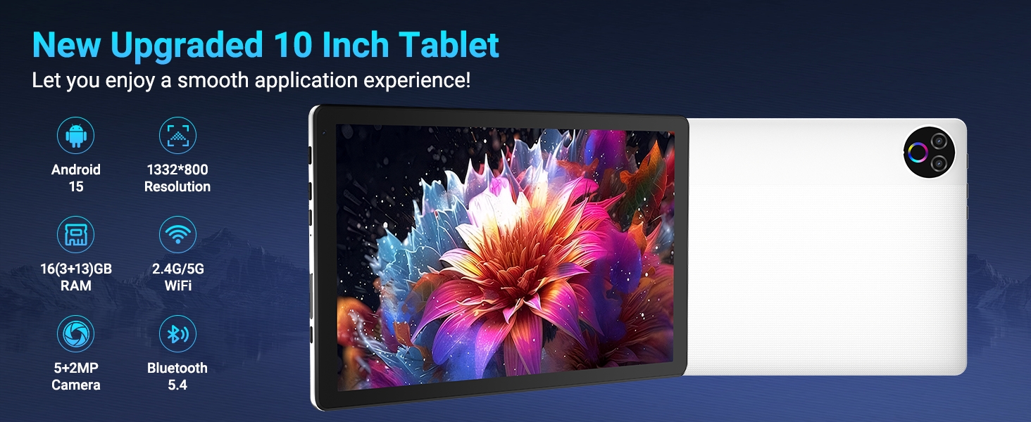 【5MP+2MP Dual Camera】The tablet built-in 5MP rear camera captures crisp, detailed shots perfect for scanning, snapping landscapes, or casual photography. The 2MP front camera enhances selfes-take. Whether you're mulitasking or connecting remotely, this 10 inch tablet android 15 balances convenience and clarily.