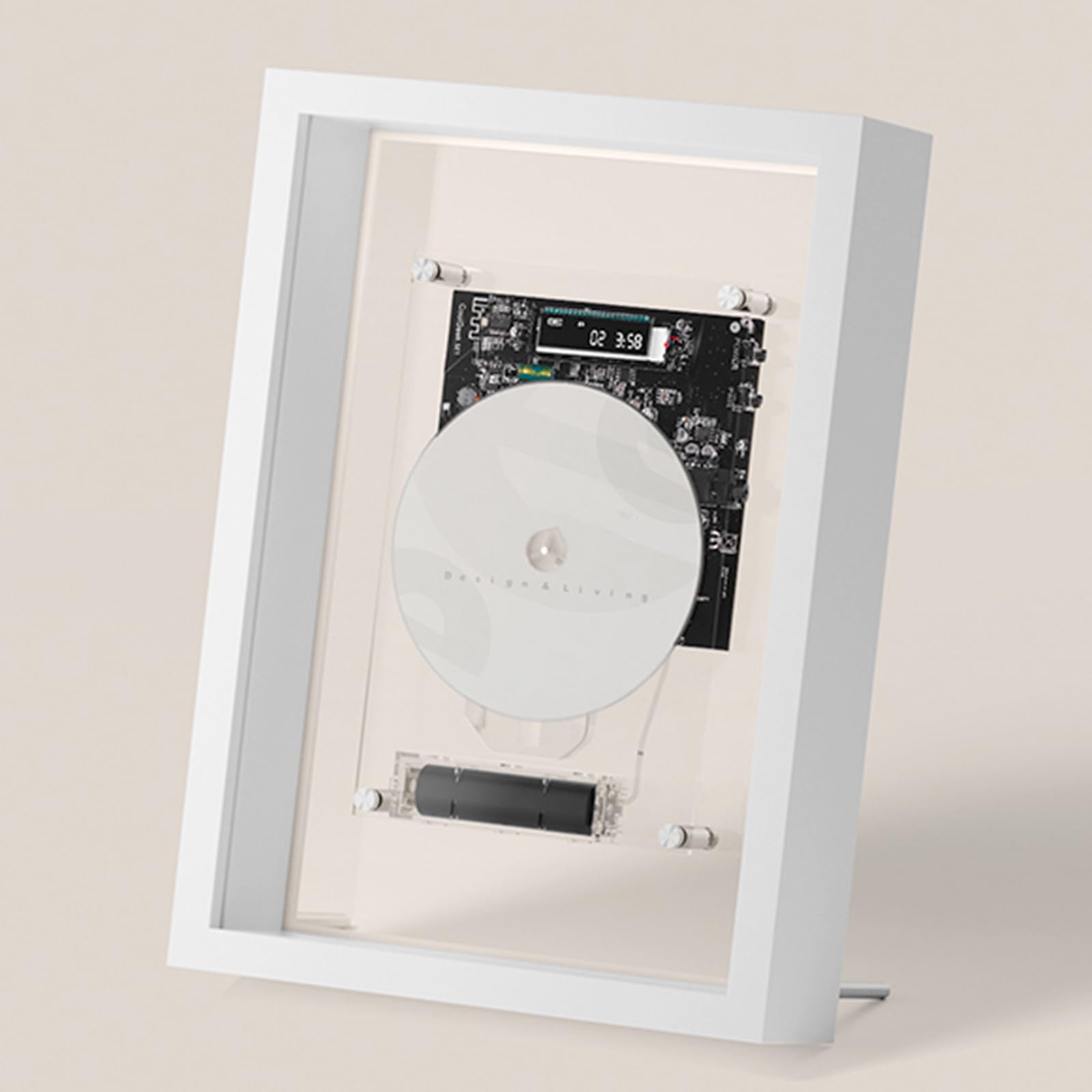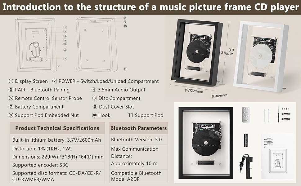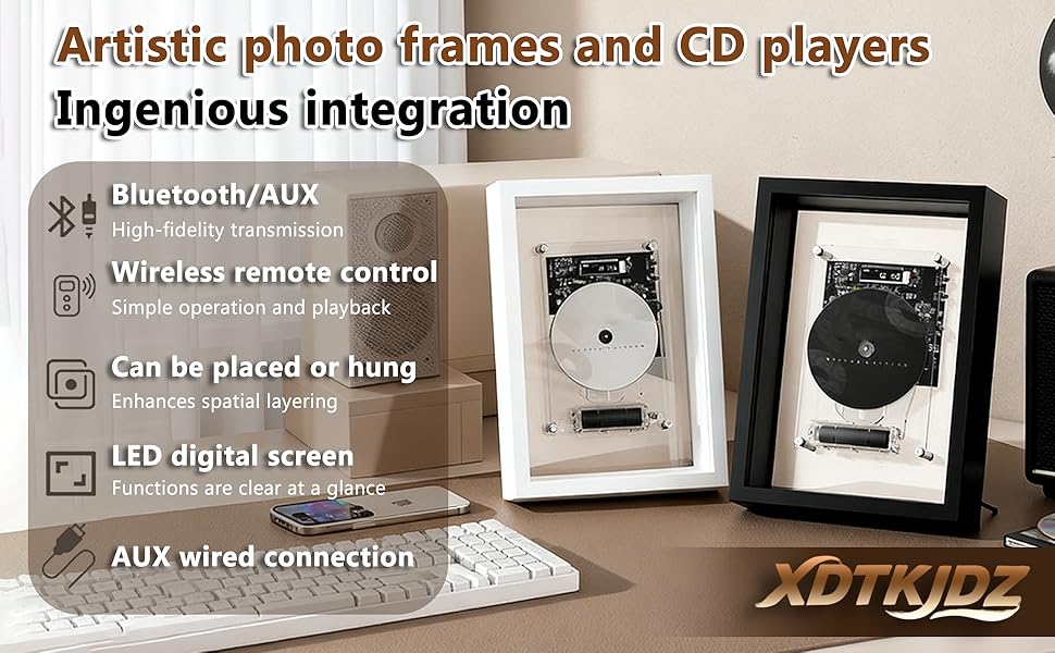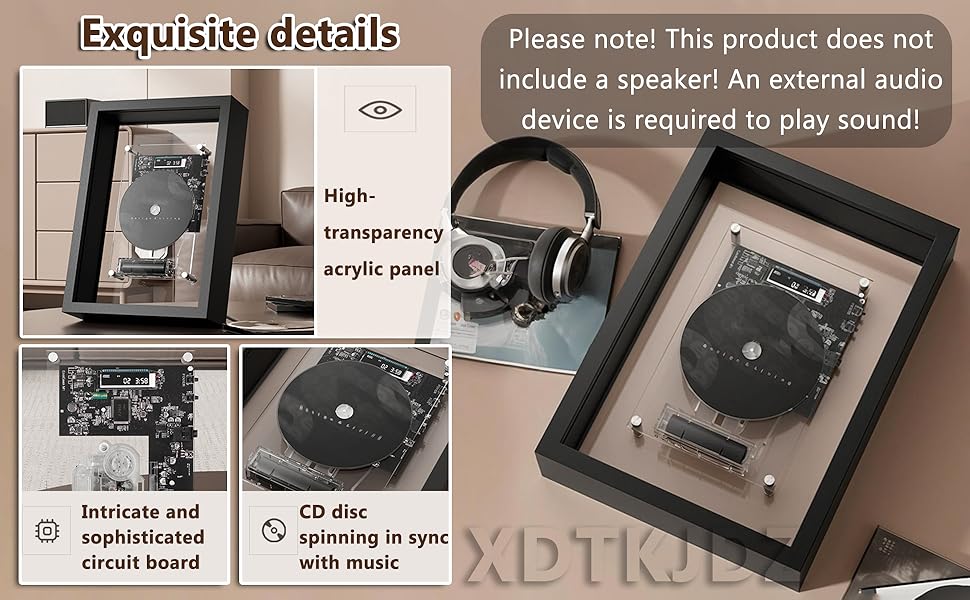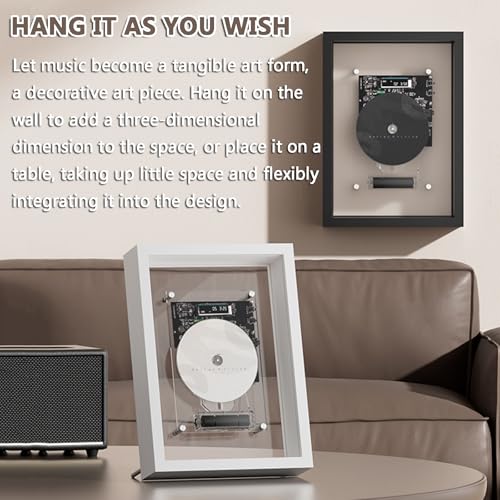 - HIGH QUALITY: The matte wood frame and transparent body create a unique aesthetic. A metal support rod on the back allows for tabletop support. Two hooks on the back allow for horizontal or vertical wall mounting. The CD rotates with the music, allowing you to enjoy your music and memories for years to come.