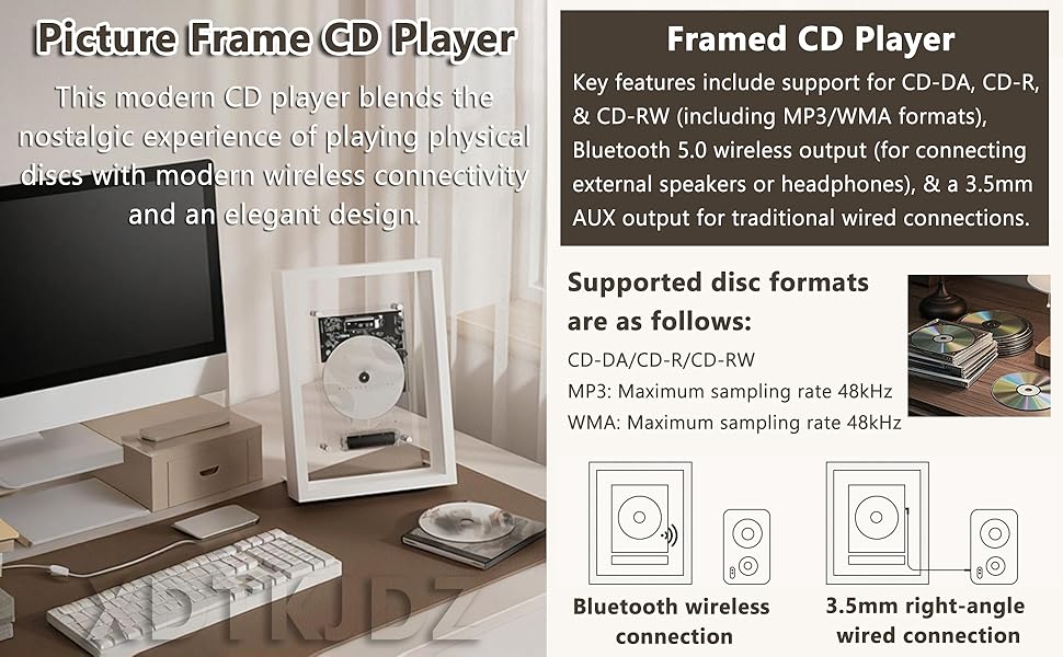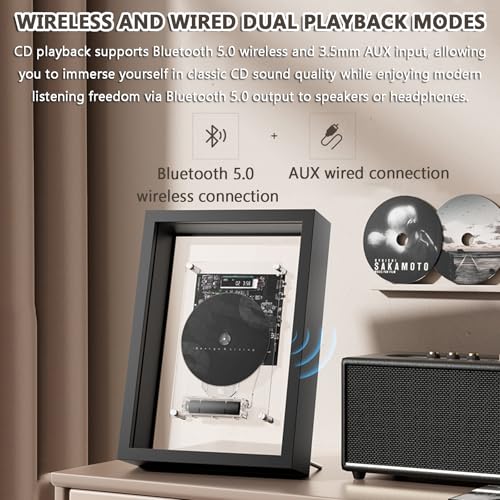 - DUAL PLAY MODE: CD playback supports Bluetooth 5.0 and a 3.5mm auxiliary input, allowing you to immerse yourself in the classic sound quality of CDs while simultaneously outputting to speakers or headphones via Bluetooth 5.0 for modern listening freedom.