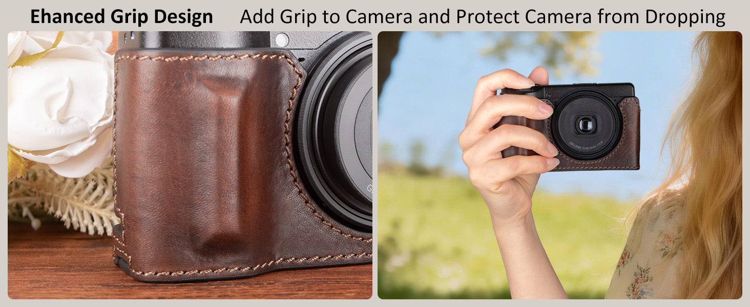 【Hand Grip Design】The hand grip design enhances the grip feeling for Ricoh GR IV GR III camera with the case on. Meanwhile, it can provide comfortable and reliable shooting experience, and add a vintage feeling for your camera.